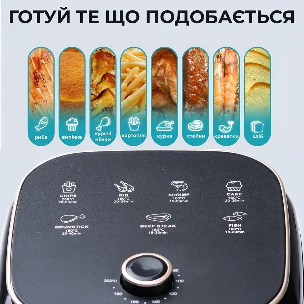 Завдяки цій аерофритюрниці немає необхідності використовувати різні прилади для випікання, обсмажування, запікання та гриля – все це можна зробити в ній. Під час її роботи не поширюються запахи, не забруднюється робоча поверхня. Потужність споживання електроенергії у фритюрниці 1400 Вт, а механічний термостат сприяє швидкому розігріванню.