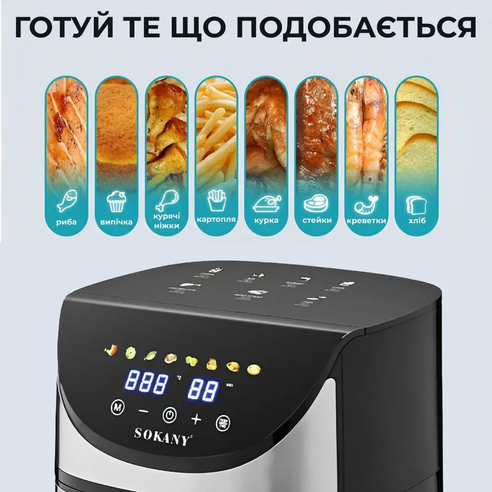 Аерофритюрниця SOKANY - ваш вірний помічник у створенні смачних і здорових страв. Електричний пристрій, що забезпечує швидке і рівномірне приготування з мінімальною кількістю олії.