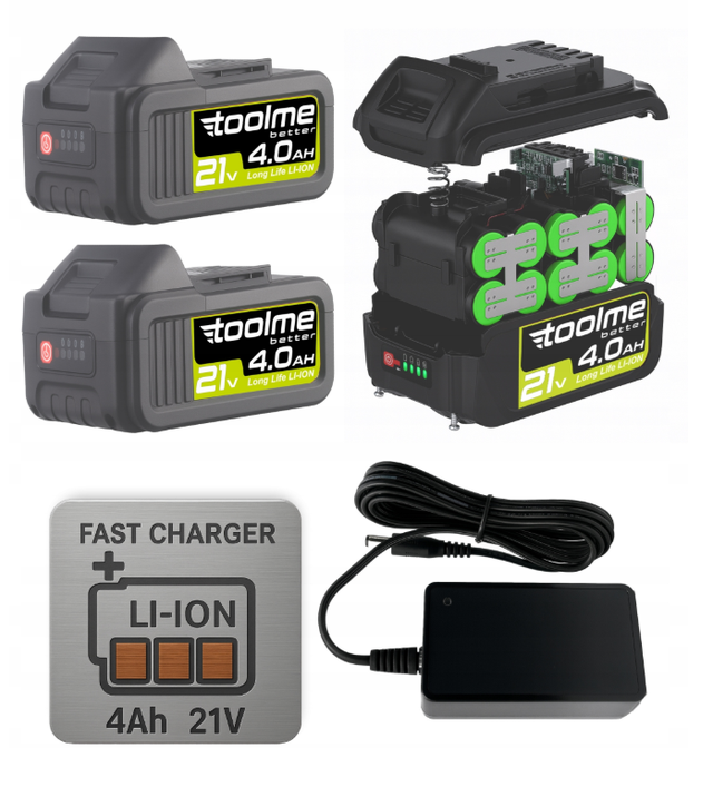У комплект входять 2 акумулятори 4.0Ah 21V з реальною ємністю та швидка зарядка. Вони забезпечують тривалу автономну роботу без падіння продуктивності.