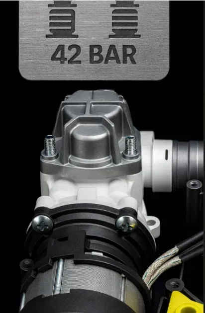 Мийка оснащена подвійною високонапірною алюмінієвою помпою боксерного типу, яка забезпечує стабільний тиск до 42 бар. Безщітковий двигун працює тихіше, служить довше та не потребує складного обслуговування.