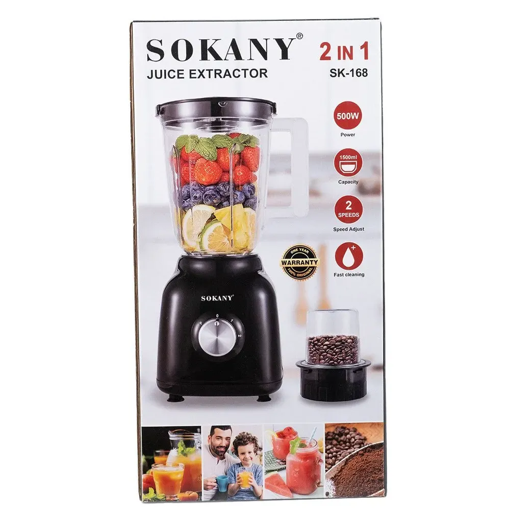 Блендер портативний 2 в 1 з чашею 1,5 л і 3 режими швидкості 500 Вт Sokany SK-168 (SK168B)