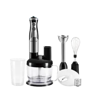 - Восьми компонентна система включає вінчик для збивання, диск для нарізання скибочками, насадку для замішування тіста, для приготування пюре, подрібнювач, соковитискач і тертку.