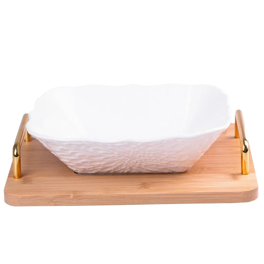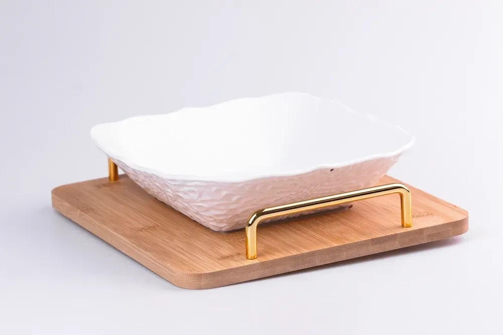 Блюдо сервірувальне порцелянове глибоке 600 мл на дерев'яній підставці 24×25.5см (HP480)
