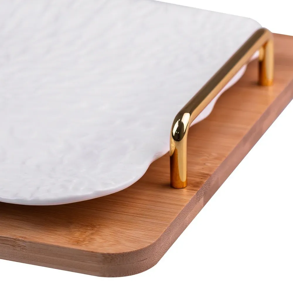 Сервірувальне порцелянове блюдо чудово поєднується з дерев'яною підставкою, оснащеною відповідним відділенням і ручками для зручного перенесення.