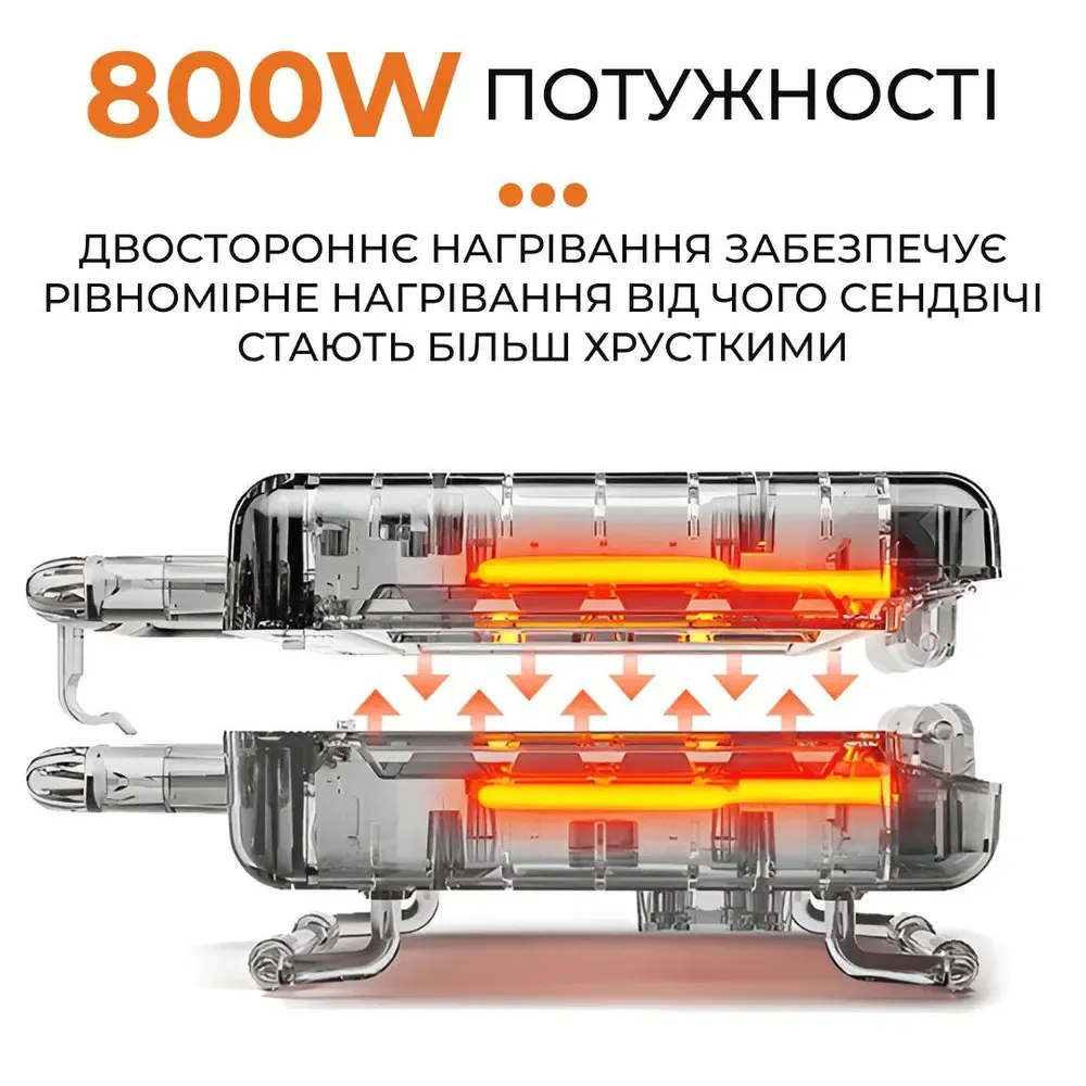 - Потужність 800 Вт. Забезпечує ефективне приготування бутербродів, сендвічів та інших страв.