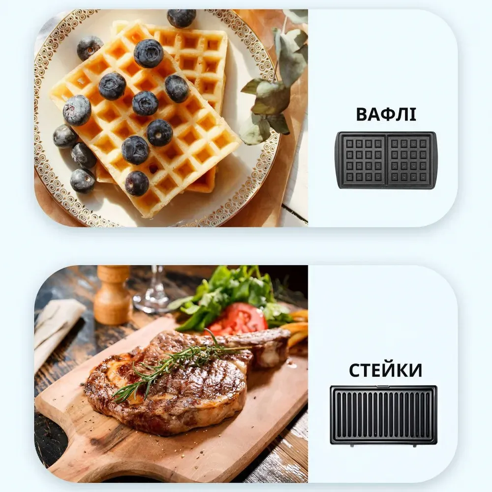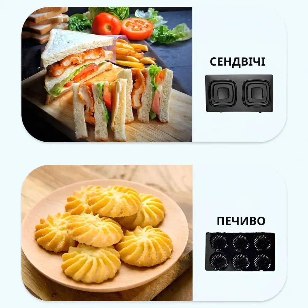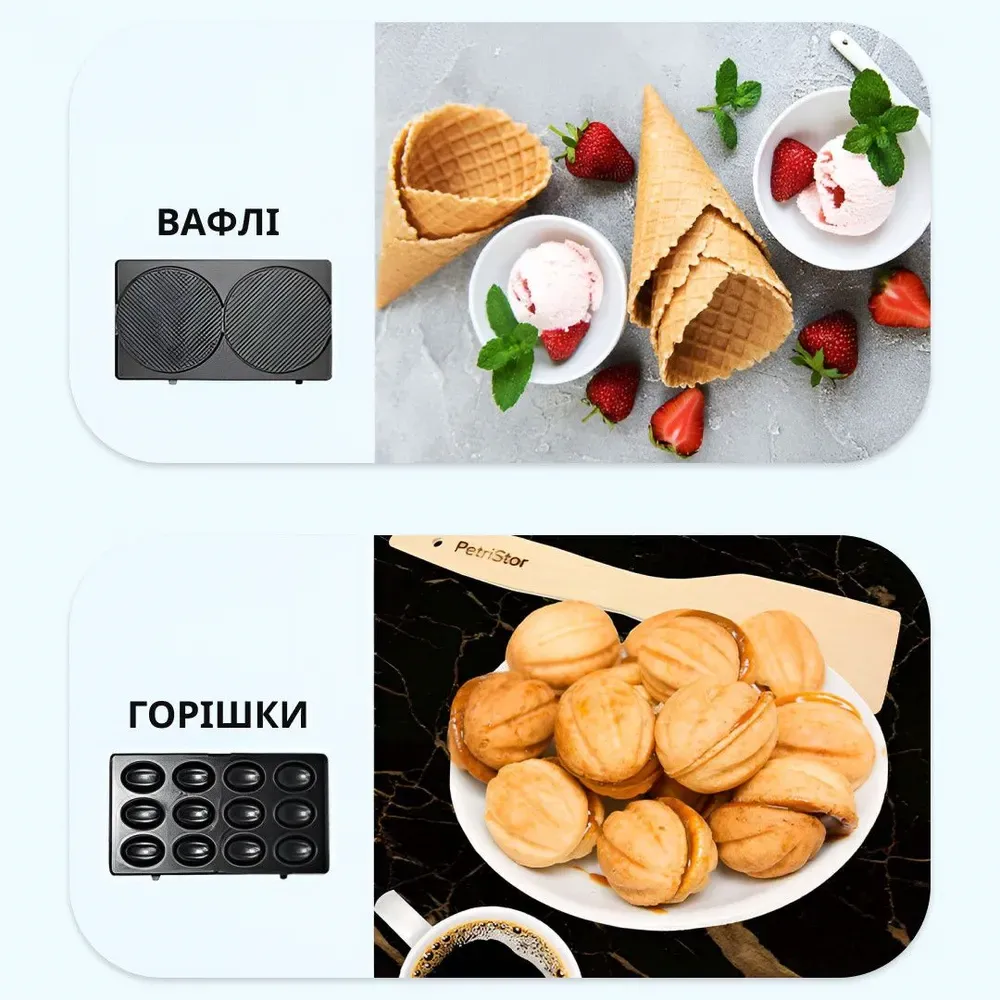 - Різноманітність насадок. Змінні насадки для вафель, гриля, сендвічів, горішків, пончиків розширюють можливості приготування, роблячи пристрій універсальним.