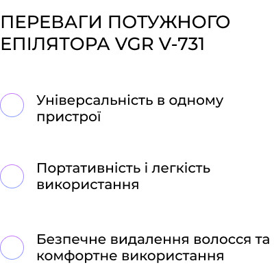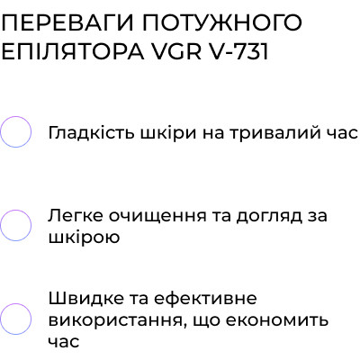 Жіночий епілятор, тример-депілятор VGR 3 в 1 - це зручний і багатофункціональний пристрій для видалення волосся на тілі та ногах. Завдяки його універсальності, практичності та безпеці, ви зможете досягти ідеально гладкої шкіри в комфортних умовах. Спробуйте жіночий епілятор VGR і насолоджуйтеся результатами!