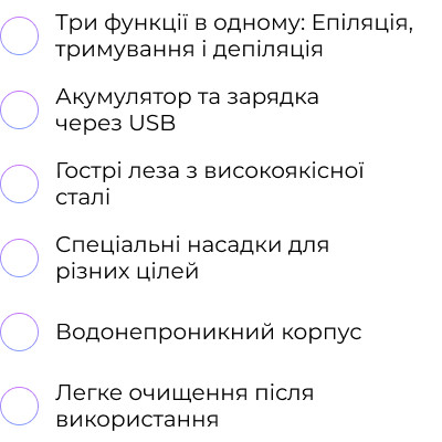 Комплектація:Бритвенная насадка|Эпилятор женский|Насадка для пяток (пемза)|USB кабель для зарядки|Щеточка для чистки
