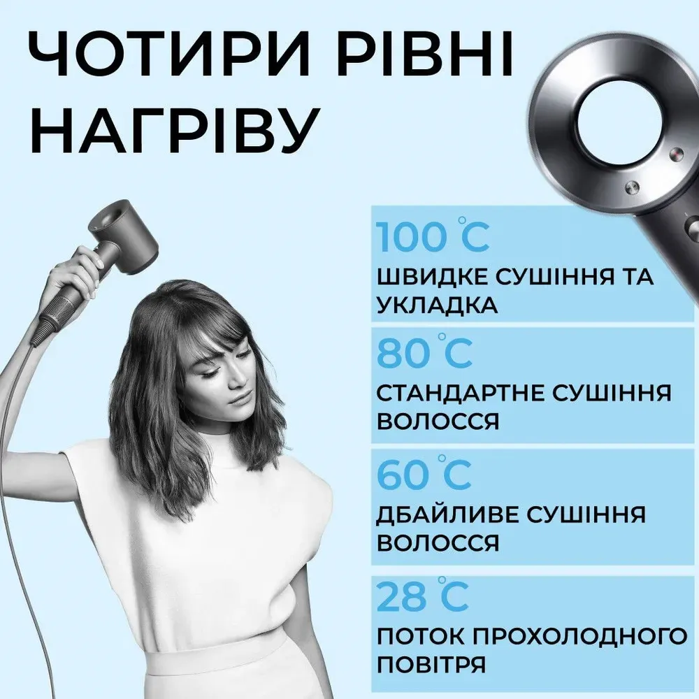 - Технологія Air Multiplier. Фен Supersonic використовує інноваційну технологію Air Multiplier, яка створює потужний та швидкісний потік повітря. Це дозволяє швидко висушити волосся, не пошкоджуючи його структуру. Ваше волосся буде виглядати здоровим і блискучим після кожного використання.