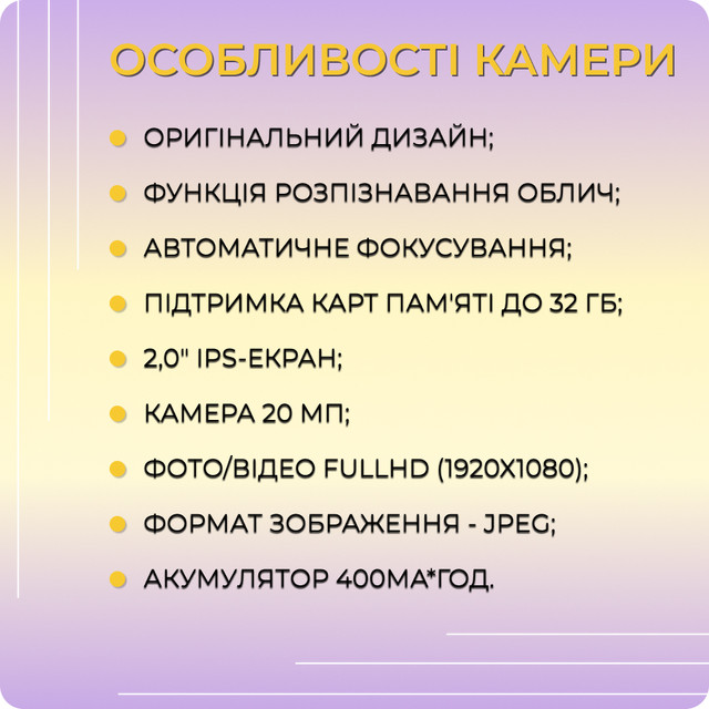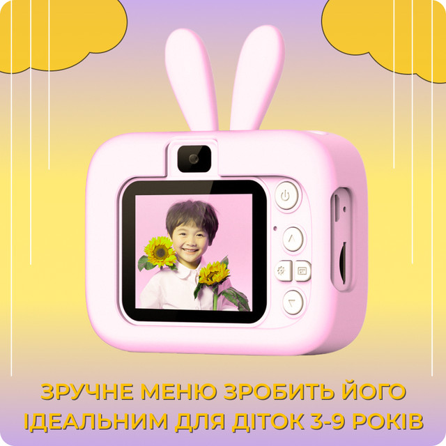 Дитячий фотоапарат чудово підійде у подарунок дітям від 3 до 9 років. Гарний, компактний та багатофункціональний фотоапарат, який знімає також відео та може служити як ігрова приставка. Фотокамера дозволяє дитині познайомитися з новим захопленням та зберегти найяскравіші моменти з життя. Спеціально для дітей додані ігри, можливість прослуховування музики, рамки та фільтри для фотографій.