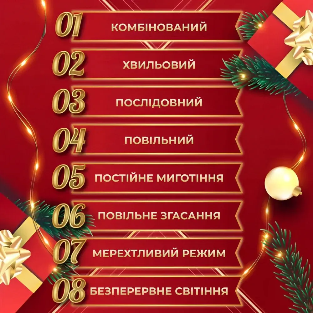 Вісім режимів роботи: Ця гірлянда пропонує вісім різних режимів роботи, дозволяючи вам вибирати та налаштовувати їх відповідно до вашого настрою та атмосфери. Від м'якого постійного свічення до пульсації та переливання кольорів – ви зможете підібрати потрібний режим для будь-якого випадку.