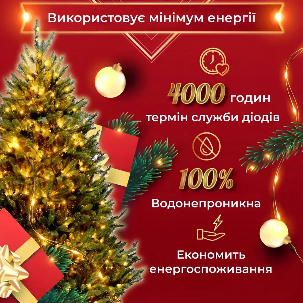 Довговічність та енергоощадження: Використовуючи сучасні LED-технології, гірлянда ефективно витрачає енергію, забезпечуючи яскраве світло та тривалий термін служби. Ви можете насолоджуватись світлом цієї гірлянди у багатьох святкових сезонах.