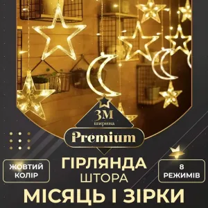 Гірлянда штора 3х0,9 м 108 LED світлодіодна зірка 9 місяць 3 мідний провід 9V 360 градусів жовта (1733060Y)