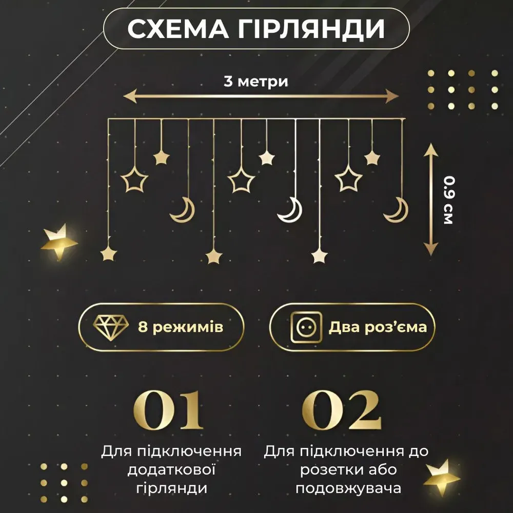 - Унікальний дизайн. Ця гірлянда поєднує в собі не тільки звичайні LED-лампочки, але й прикрашена трьома великими зірками, шістьма маленькими зірками та трьома місяцями. Ці додаткові елементи надають їй особливої чарівності і дозволяють створювати більш різноманітні декоративні композиції.