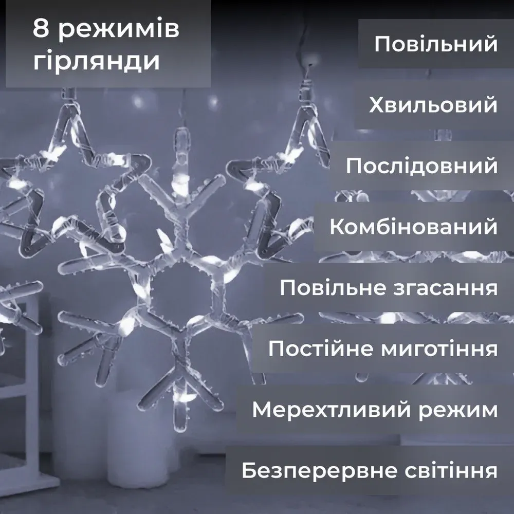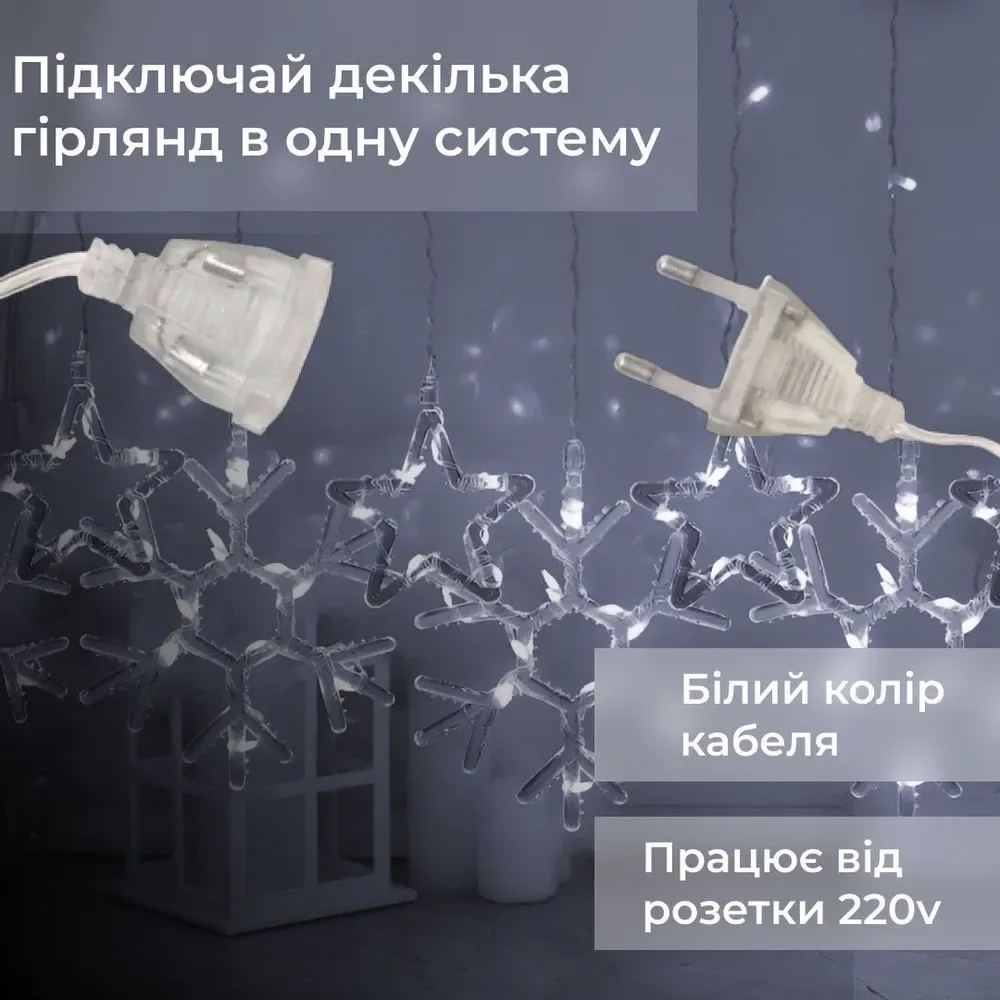 - Легка установка. Гірлянда має просту та зручну конструкцію, яка дозволяє легко встановити її в будь-якому місці. Форма сніжинок робить її ідеальним вибором для прикраси вікон, стін, арок або балконів.