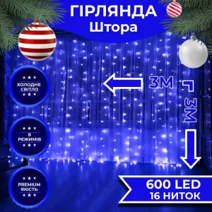 Гірлянда штора 3х3 м на 600 LED світодіодна білий провід 16 ліній синя (ZWM2600LEDBL)