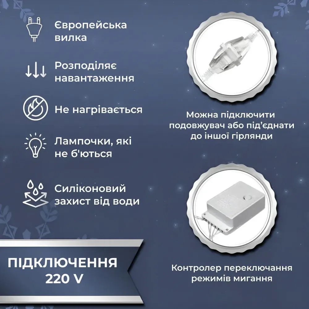 - Довговічність та енергоефективність. Використовуючи сучасні LED-технології, гірлянда ефективно витрачає енергію, забезпечуючи яскраве світло та тривалий термін служби. Ви зможете насолоджуватися світлом цієї гірлянди у багатьох святкових сезонах, заощадивши на електроенергії.