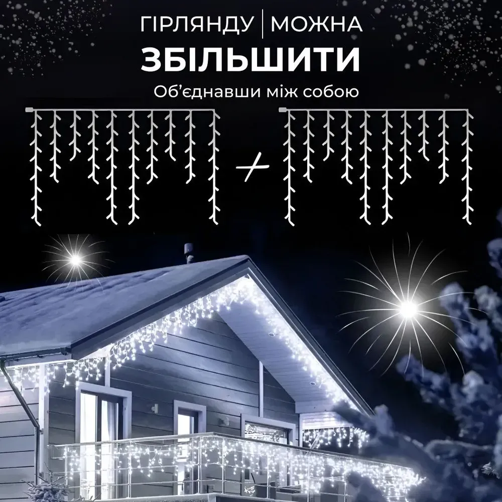 Вулична гірлянда Бахрома - ідеальне рішення для надання святкового настрою вашому будинку або заходу завдяки своєму світінню в технології флеш. Вона чудово підходить для декорування віконних отворів, арок, фасадів та вітрин.