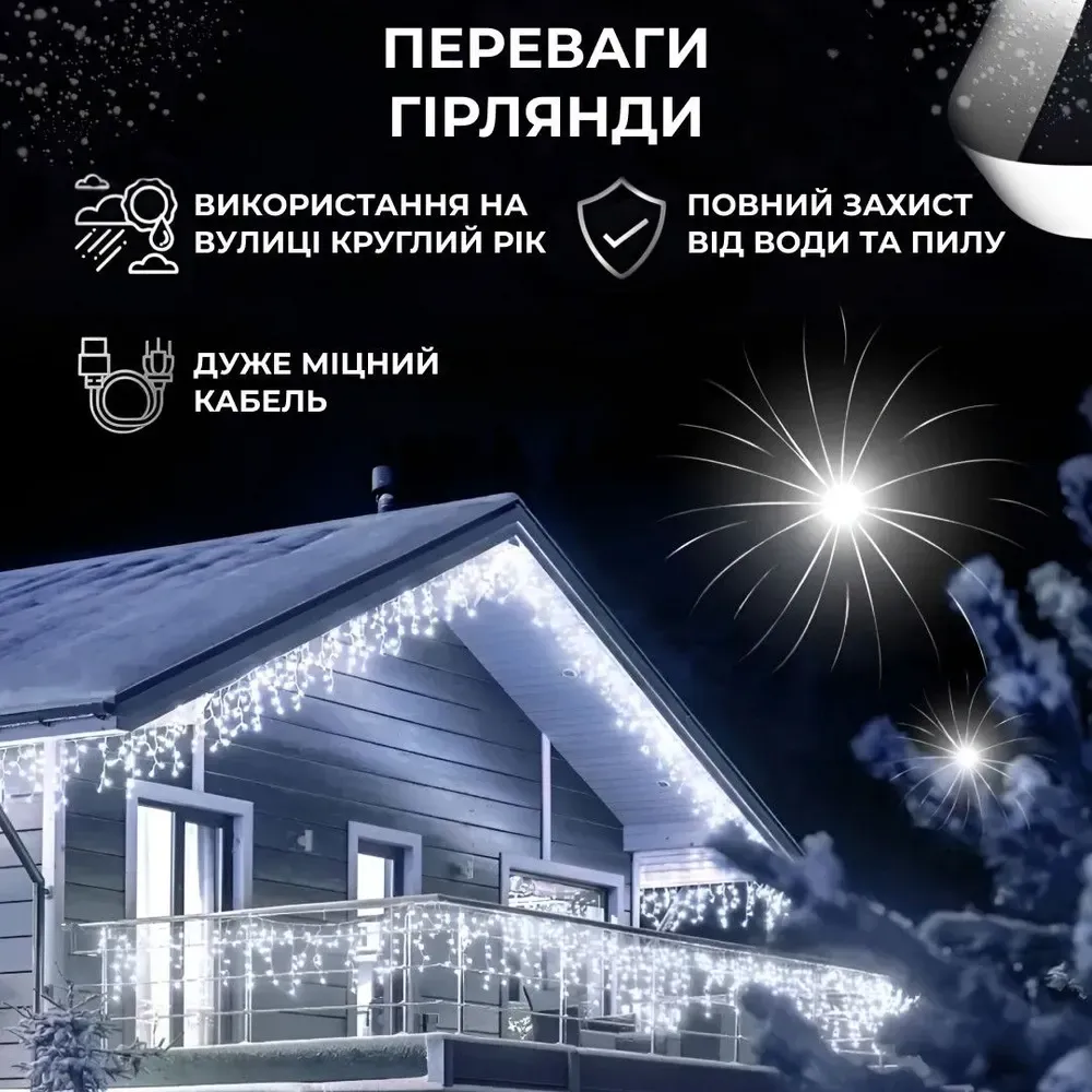 Вулична гірлянда Бахрома - чудовий вибір для тих, хто хоче створити святкову атмосферу на власній ділянці, привернути увагу оточуючих до кафе чи ресторану, оформити дерева чи ґанок будинку. Вона дозволяє створювати чудові світлові ефекти завдяки роботі в технології флеш.