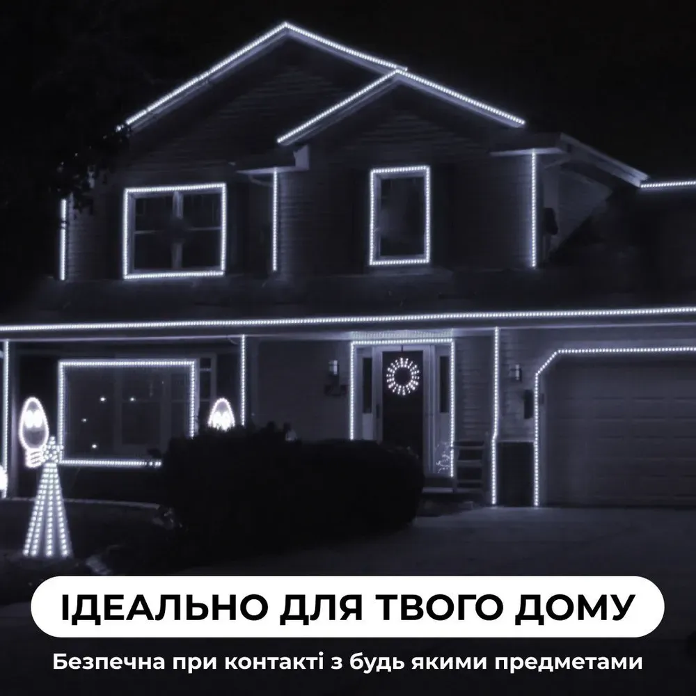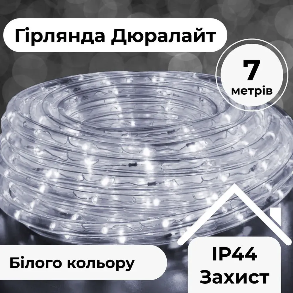 Світлодіодна гірлянда Дюралайт чудово підійде для тераси або лаундж-зони, оновлення екстер'єру ресторану або оформлення фотозони. Пристрій являється загерметизованим ПВХ-проводом довжиною 7 метрів з послідовно розташованими світлодіодами. На кінцях передбачені штекерні роз'єми із закруткою, що дозволяють послідовно з'єднувати кілька гірлянд. Така конструкція дає можливість легко виконати оформлення дерев, карнизів, сходів і вікон і навіть дахів будівель для створення приголомшливих світлових ефектів.