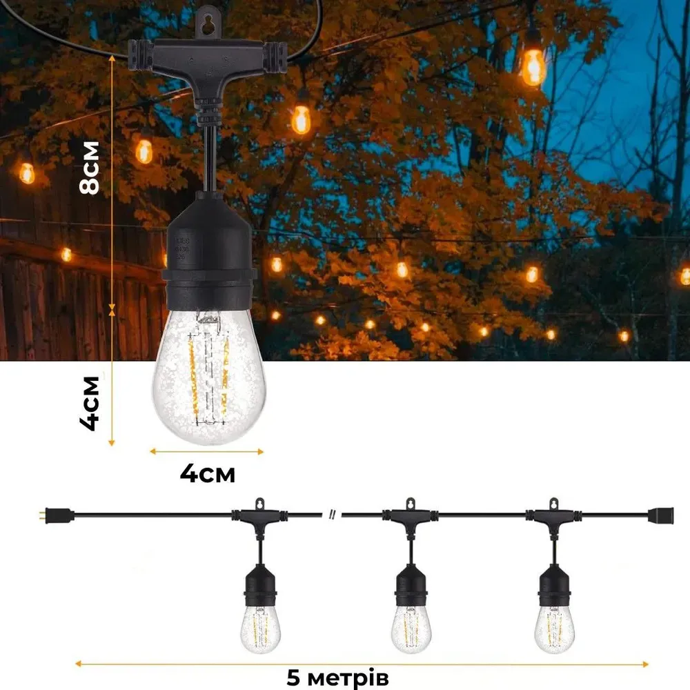 Світлодіодна ретро гірлянда F27 на 10 ламп, довжиною 5 метрів - ідеальний спосіб створити незабутню атмосферу світлового свята в будь-якому просторі. Ця гірлянда поєднує в собі класичний дизайн з сучасною технологією LED, забезпечуючи надійне та довговічне освітлення для вашого заходу. Оздоблення буде виглядати вражаюче та неповторно, завдяки наступним особливостям: