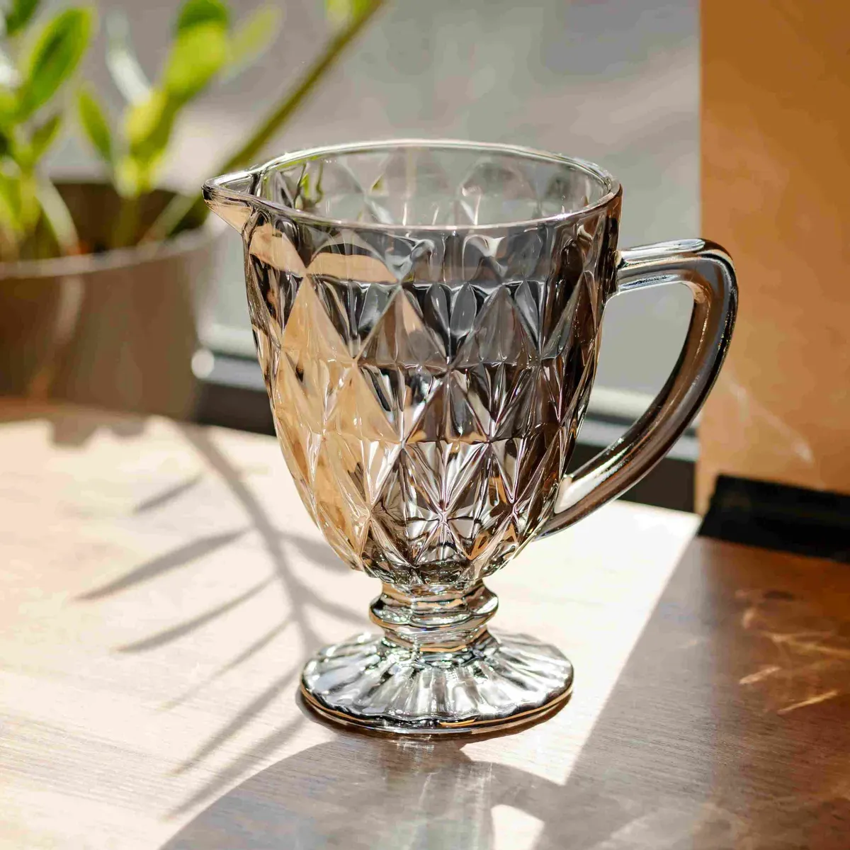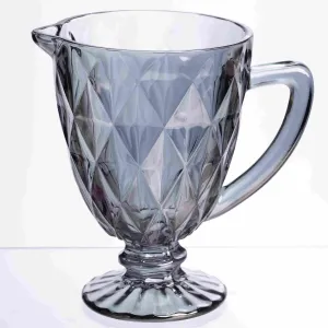 Стильний та компактний графин із тонованого скла, призначений для сервірування холодних напоїв. Завдяки димчастому відтінку та виразній фактурі він стане елегантним доповненням до столу. Особливості: Фактурний візерунок: Стінки глечика декоровані великою алмазною гранню, яка красиво заломлює світло. Графітовий відтінок: Димчасте скло виглядає сучасно та благородно, приховуючи можливий осад у напої. Ергономічність: Зручна ручка та виражений носик забезпечують акуратне використання. Стійкість: Широка основа на ніжці гарантує стабільність графину на будь-якій поверхні. Ідеально підходить для подачі води, лимонадів, соків або домашнього вина. Характеристики: Матеріал: скло Об'єм: 1 л Розміри (діаметр/висота): 13/19,3 см Вага: 600 г