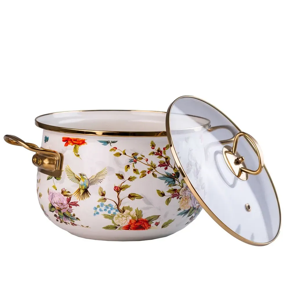 Ця каструля поєднує в собі функціональність і естетику, маючи міцне емальоване покриття і скляну кришку. Стійка емаль забезпечує рівномірний розподіл тепла, а скляна кришка дає змогу спостерігати за процесом приготування.