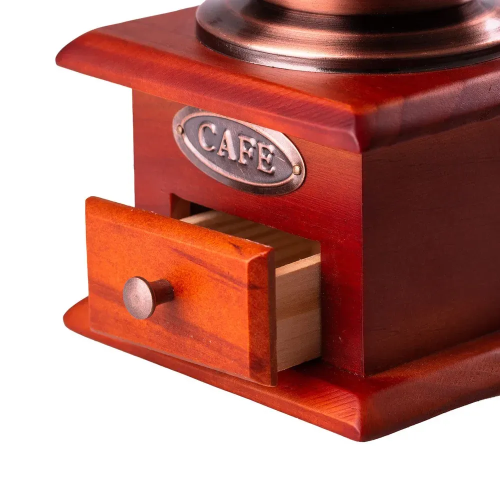 Дерев'яна шухляда не тільки додає естетики в дизайн, а й зручна для збору меленої кави. Відчуйте справжній смак і аромат кави з цією надійною і стильною ручною кавомолкою.