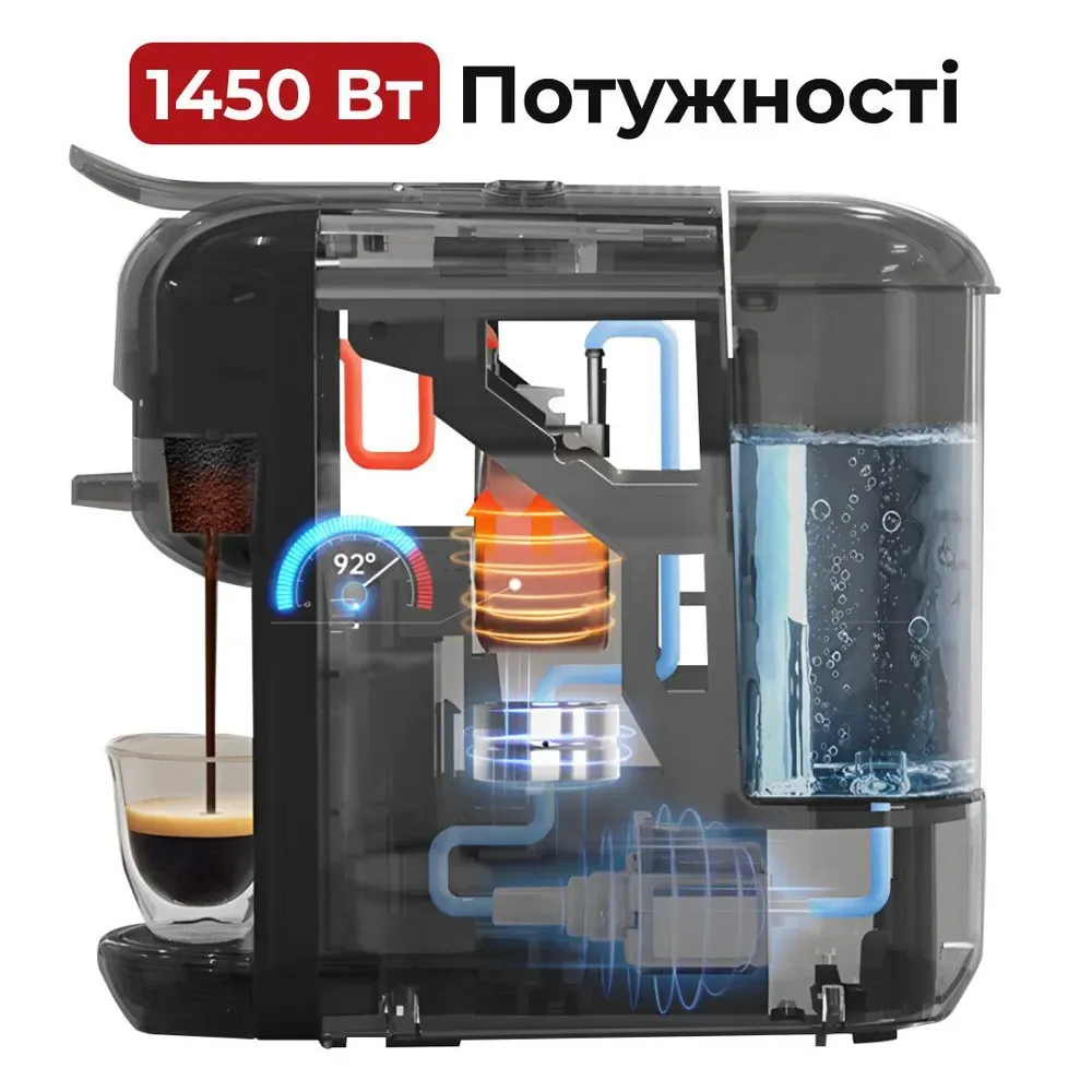 1. Потужність 1450 Вт. Висока потужність кавоварки забезпечує швидке нагрівання води та створення потрібного тиску для приготування смачної кави.