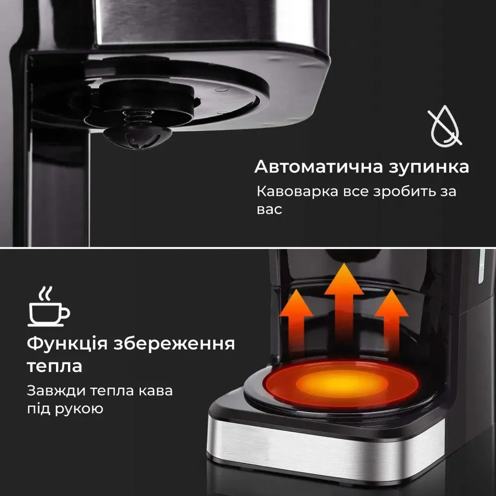 - Антипригарна пластина для підігріву і функція підтримки тепла. Ці характеристики забезпечують утримання температури приготованої кави та запобігають перегріванню, що дає змогу насолоджуватися гарячим напоєм протягом тривалого часу.