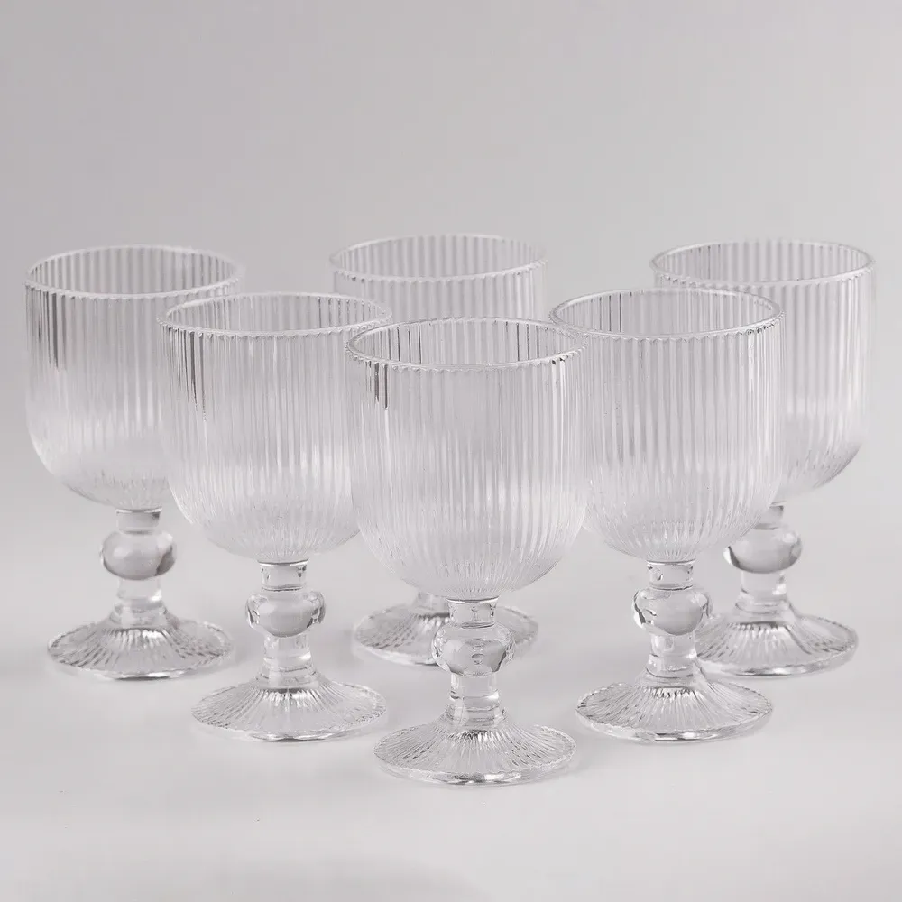 Набір бокалів для вина являє собою набір із шести бокалів для вина, виготовлених з товстого прозорого скла. Келихи мають фігурний дизайн з ребристою поверхнею, що надає їм елегантного та вишуканого вигляду.