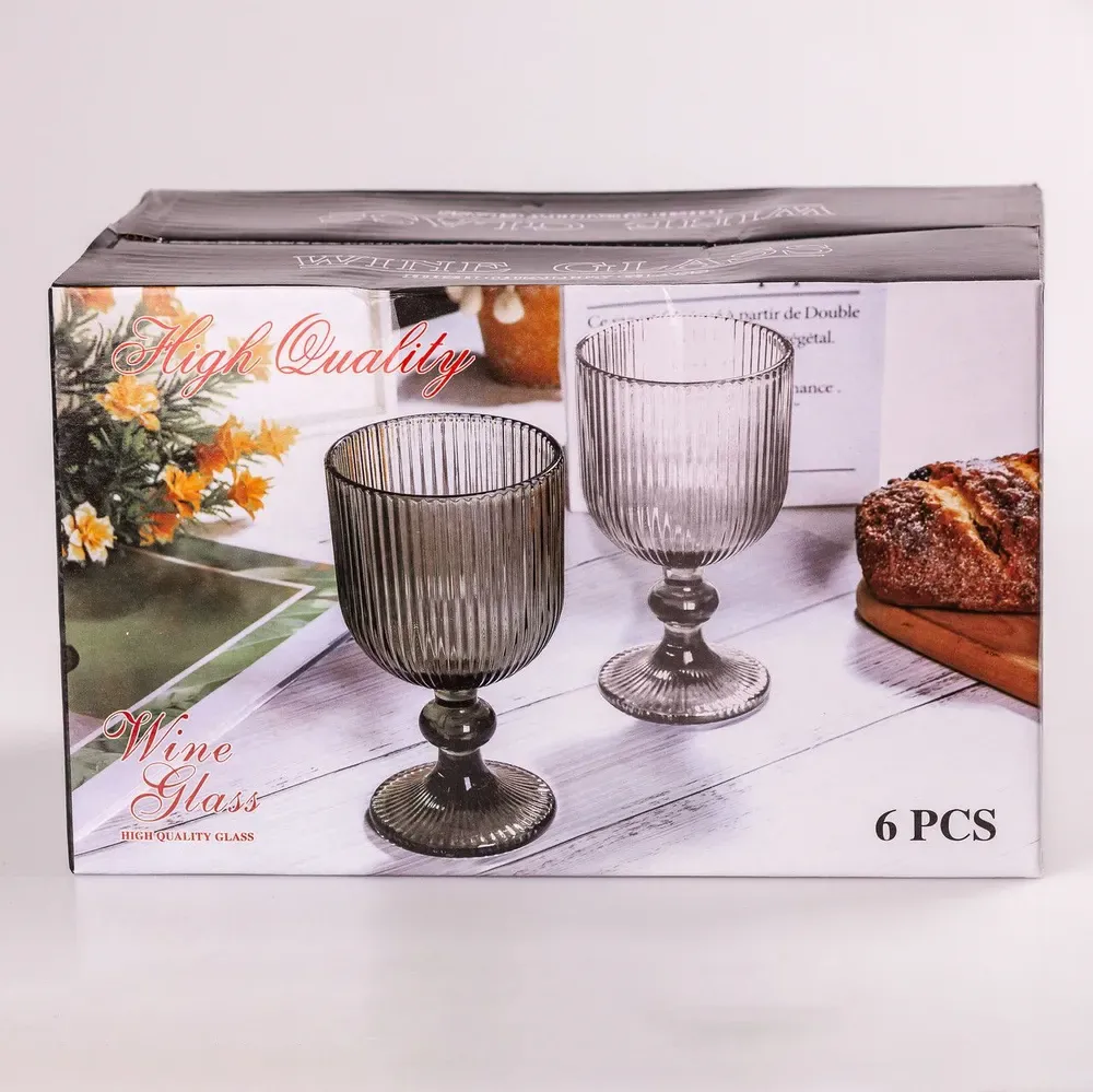 Набір бокалів для вина являє собою набір із шести бокалів для вина, виготовлених з товстого прозорого скла. Келихи мають фігурний дизайн з ребристою поверхнею, що надає їм елегантного та вишуканого вигляду.
