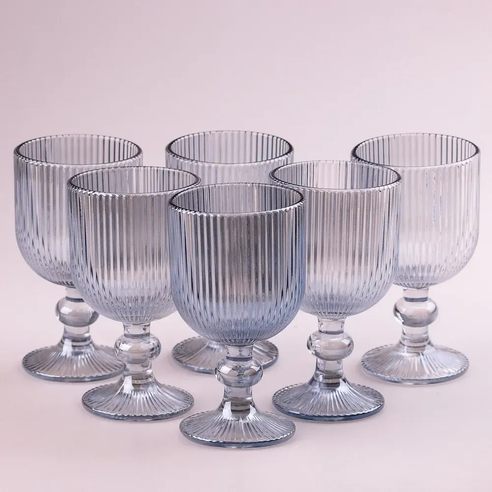 Келих для вина високий фігурний прозорий ребристий з товстого скла набір 6 шт Блакитний (HP7115BL)