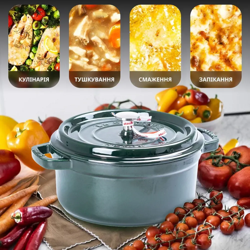 - Універсальність: підходить для використання на всіх типах плит, включаючи індукційні, а також у духовці.