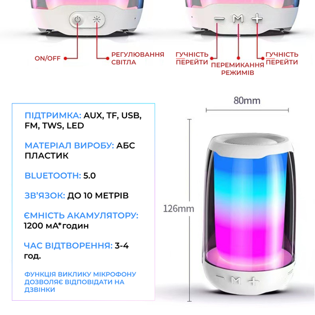 - Можливість відтворення музики з Micro SD карти, через AUX-вхід і 3,5 джек.