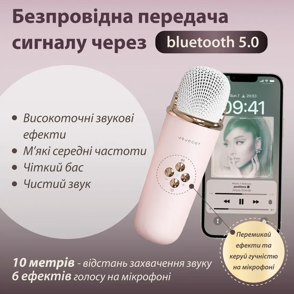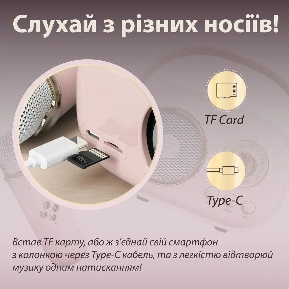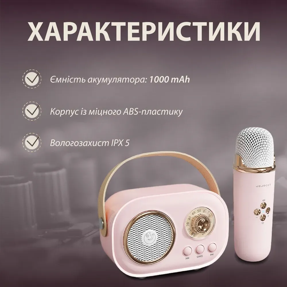 Колонка має широкий функціонал, підтримує Bluetooth 5.0, FM і USB Card, а значить ви можете слухати музику зі свого телефону або флешки, приєднатись до улюбленої радіостанції. Крім цього, акустика дає можливість влаштувати незабутню караоке-вечірку завдяки невеликому, але потужному мікрофону, акумулятор якого розрахований на 2 години роботи.