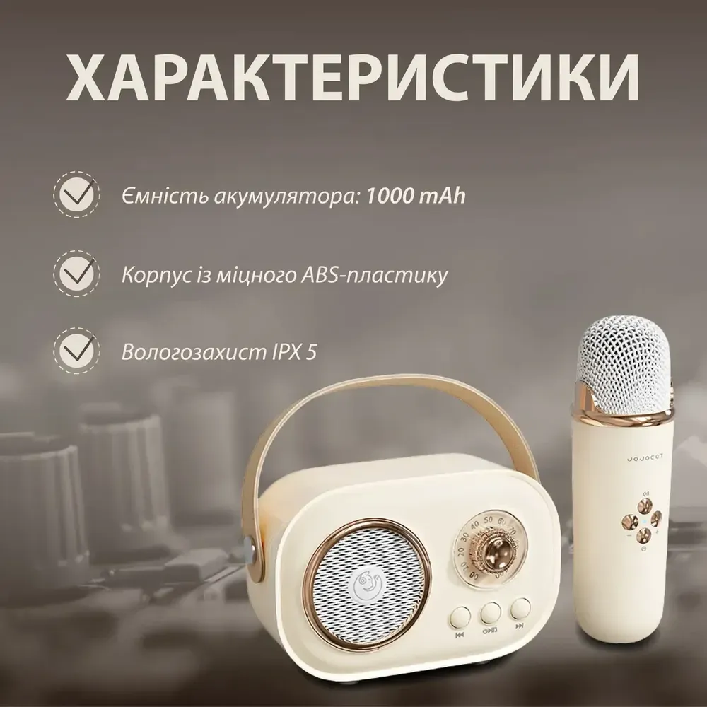 Колонка має широкий функціонал, підтримує Bluetooth 5.0, FM і USB Card, а значить ви можете слухати музику зі свого телефону або флешки, приєднатись до улюбленої радіостанції. Крім цього, акустика дає можливість влаштувати незабутню караоке-вечірку завдяки невеликому, але потужному мікрофону, акумулятор якого розрахований на 2 години роботи.