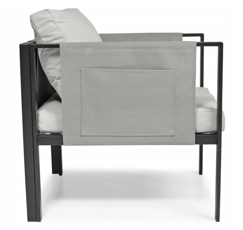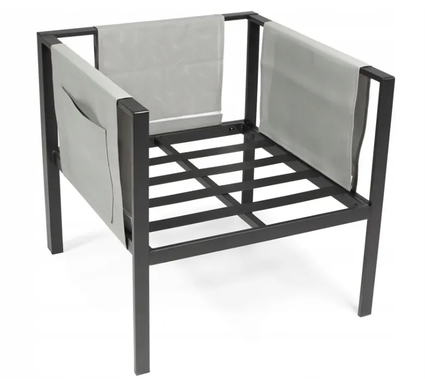 - Спинки крісел і дивана покриті водостійким матеріалом textilene — це сітка зі штучних волокон, яка пропускає воду та повітря, дуже міцна й часто використовується у виробництві садових меблів.