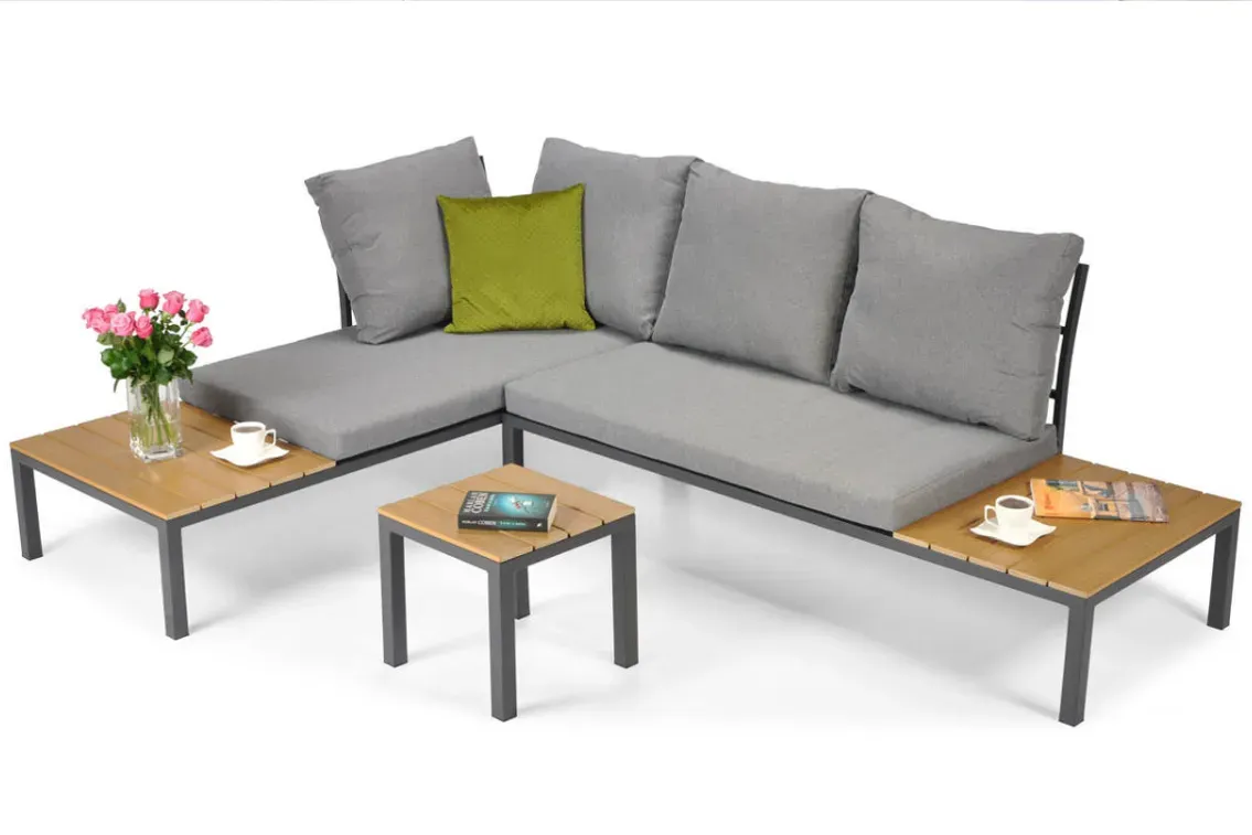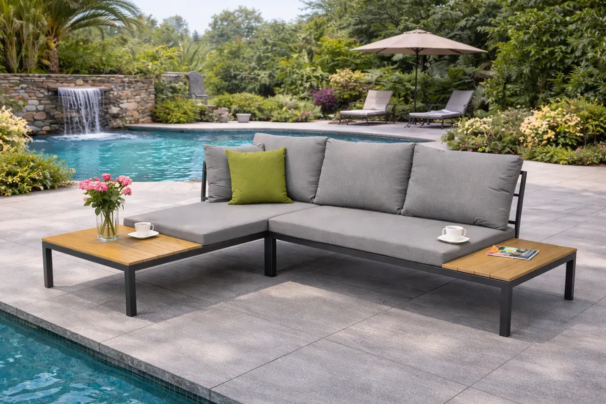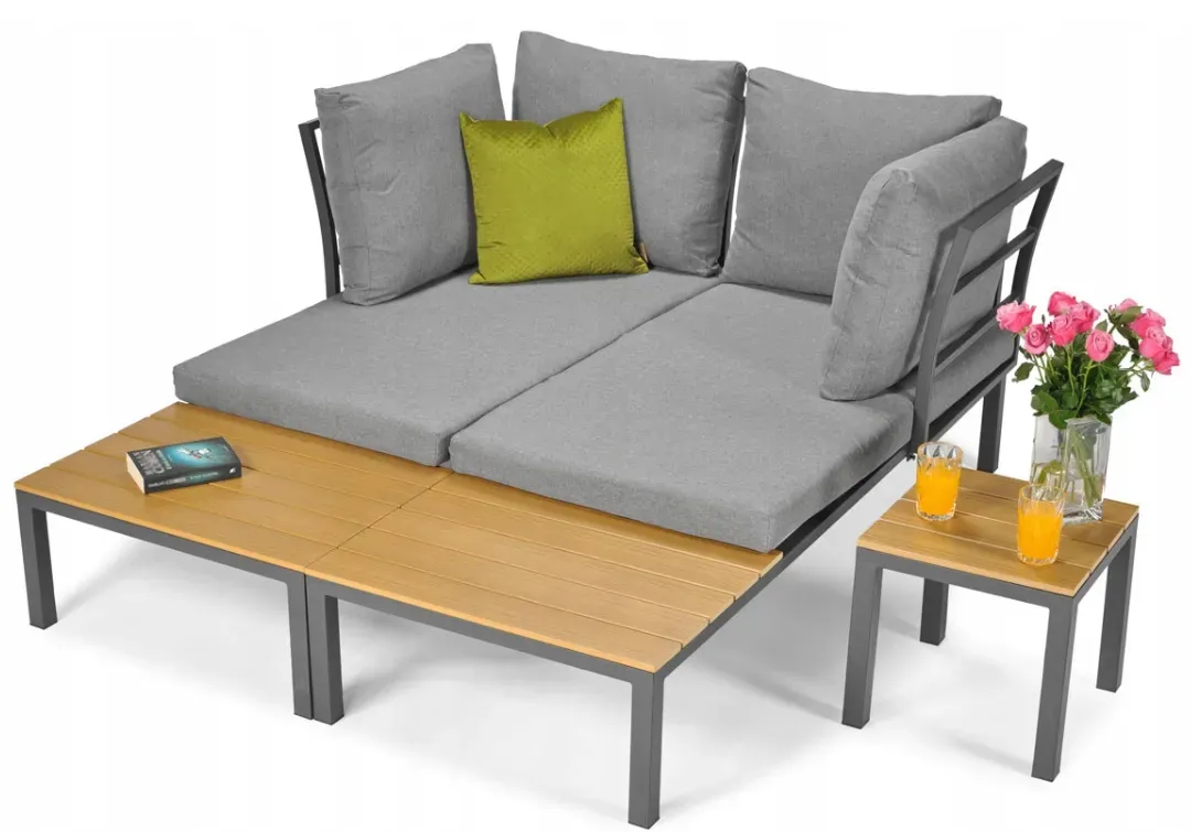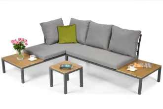 Садовий кутовий диван LAGOS — це сучасний та практичний комплект для комфортного відпочинку на свіжому повітрі. Модульна конструкція дозволяє легко змінювати конфігурацію дивана залежно від потреб і простору. Набір складається з двох диванів і столика, створюючи затишну зону відпочинку для сім’ї або гостей у саду, на терасі чи патіо.