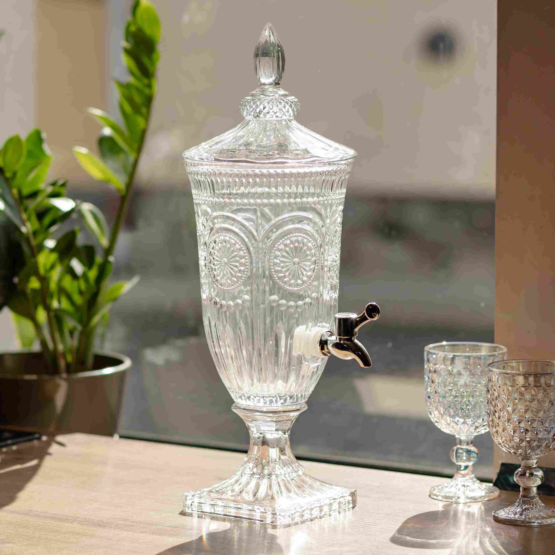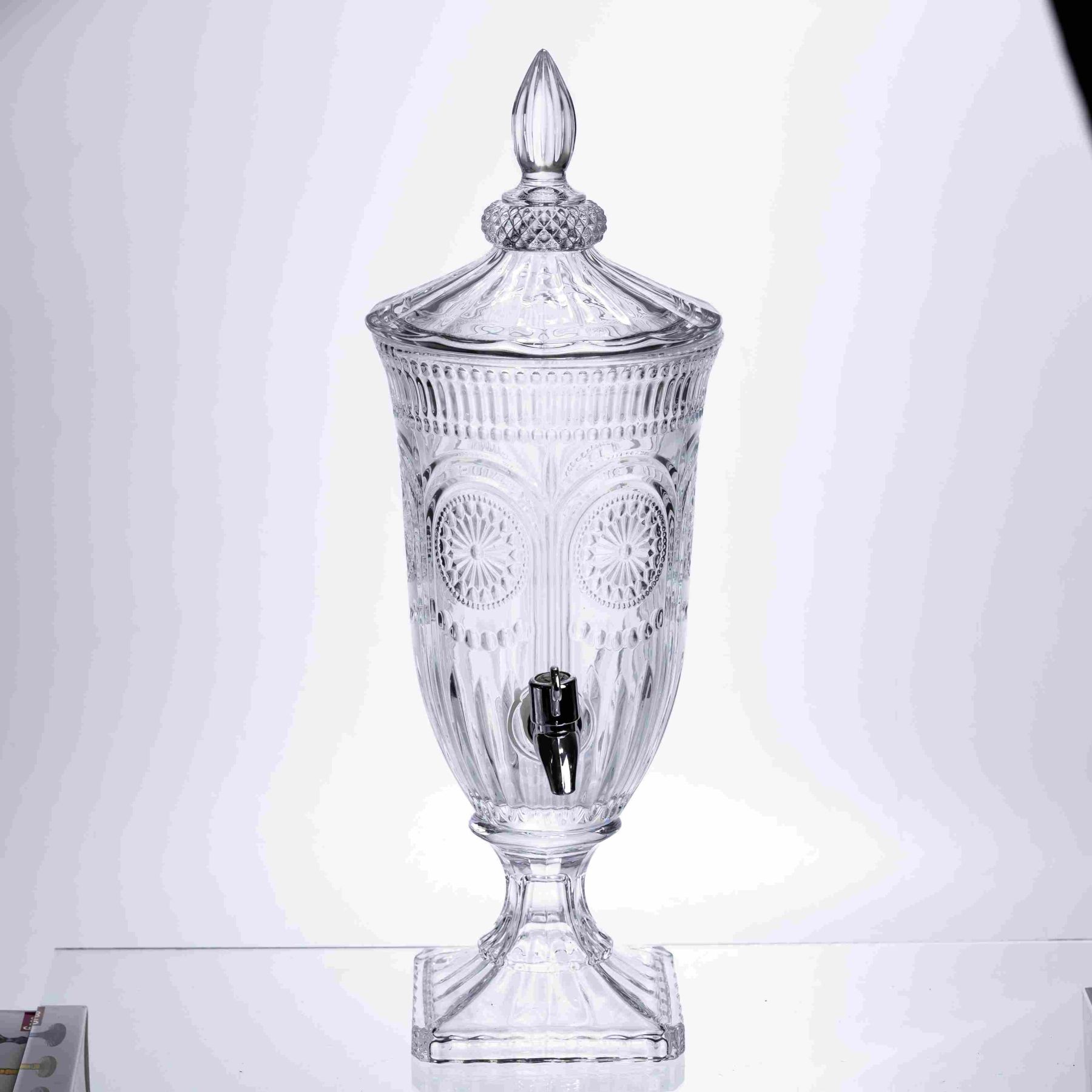 Компактний диспенсер із прозорого скла зі складним рельєфним орнаментом. Тонка проробка візерунків та класична форма роблять його чудовим вибором для сервірування святкового столу, фуршетів чи затишних чаювання на веранді. Особливості: Фактура: Поверхня декорована деталізованим малюнком з розетками та вертикальними гранями, які створюють гарну гру відблисків. Об'єм 2 літри: Зручний формат для домашнього використання – лимонадниця не займає багато місця, але її об'єму достатньо для сімейного обіду. Витончений силует: Висока ніжка на квадратній основі та декоративна кришка з фігурним навершям надають виробу класичного, урочистого вигляду. Чистота матеріалу: Прозоре скло без відтінків дозволяє повністю сфокусуватися на кольорі та складі напою (фрукти, ягоди, лід). Масивна основа надійно утримує диспенсер на поверхні столу. Характеристики: Матеріал: скло Об'єм: 2 л Діаметр: 17 см Висота: 48 см Матеріал краника: пластик Вага: 2,9 кг