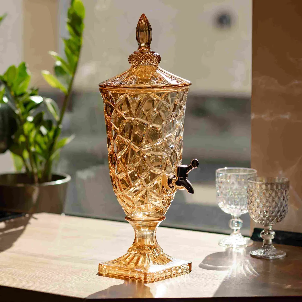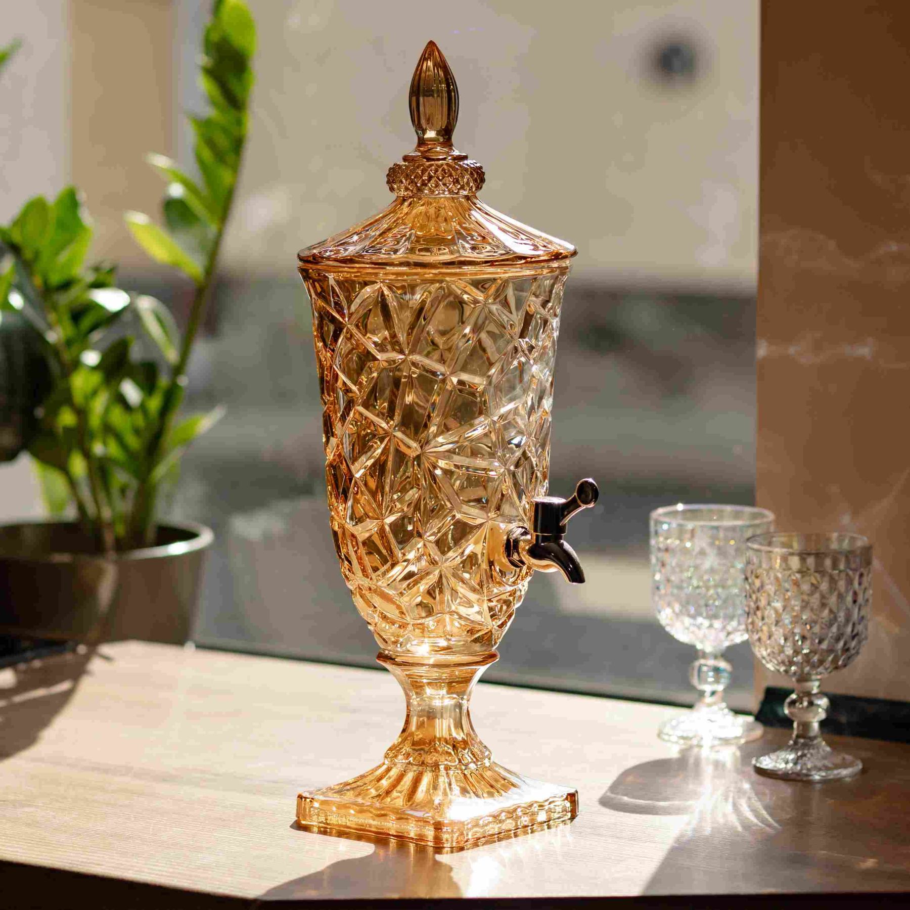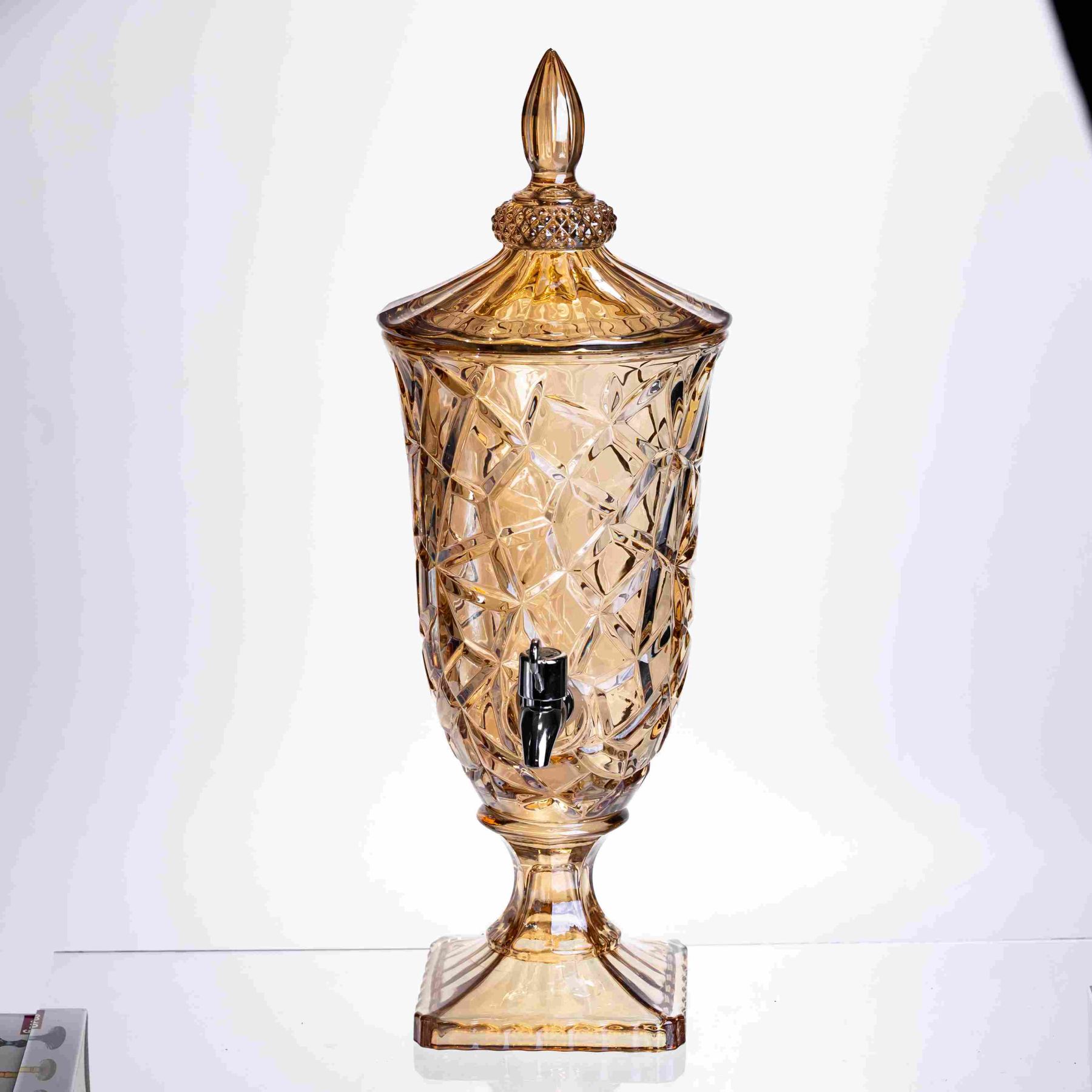 Компактний диспенсер із щільного скла теплого бурштинового відтінку. Підходить для гарної подачі води, лимонадів та прохолодних напоїв як на святковому столі, так і у повсякденному житті. Особливості: Бурштинове скло: Приємний золотистий колір матеріалу створює затишну атмосферу та ефектно підсвічує напій зсередини. Об'єм 2 літри: компактний розмір, який зручно розмістити навіть на невеликому кухонному столі або барній стійці. Дизайн: Рельєфний візерунок на стінках красиво заломлює світло, підкреслюючи форму виробу. Стійкість: Масивна квадратна основа забезпечує надійне положення диспенсера на поверхні. Комплектація: У комплекті є скляна кришка із декоративним елементом, яка щільно закриває ємність. Ідеально підходить для лимонадів, соків, компотів або води з фруктами. Характеристики: Матеріал: скло Об'єм: 2 л Діаметр: 17 см Висота: 48 см Матеріал краника: пластик Вага: 2,9 кг