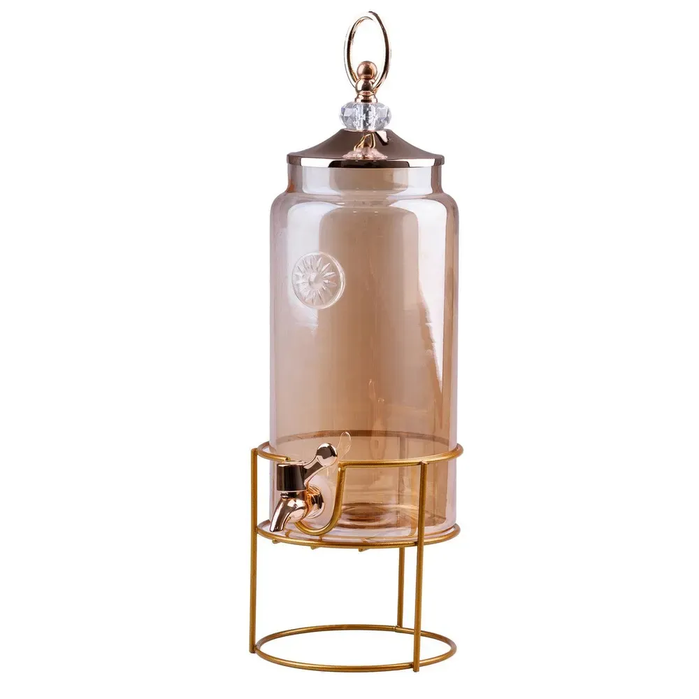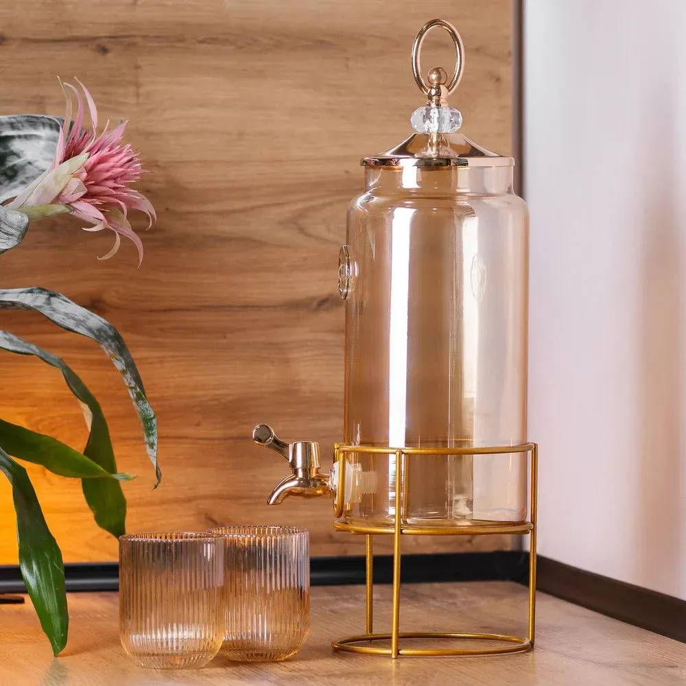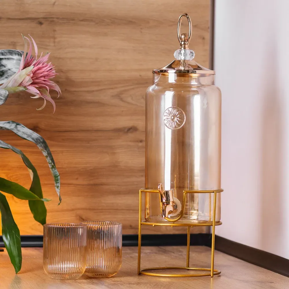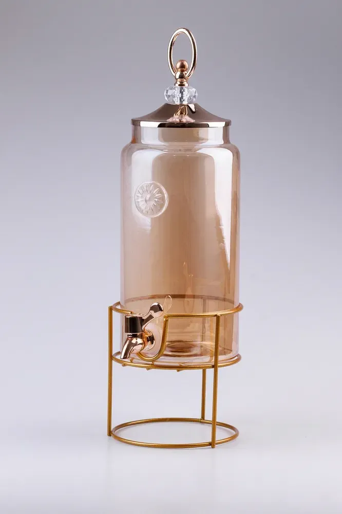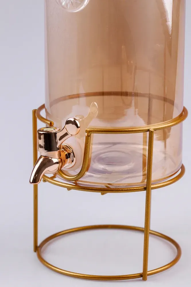 Лимонадниця об'ємом 2 літри з краном, встановленим на металевій підставці, являє собою стильне і функціональне рішення для сервірування напоїв.