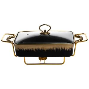 Мармітниця порцелянова прямокутної форми призначена для подачі та підтримання температури готових страв під час сервірування. Лаконічне поєднання чорного кольору з золотистим оздобленням по краях робить виріб доречним як для домашнього використання, так і для банкетів, кейтерингу або ресторанного формату. Прямокутна форма зручна для розміщення на столі та раціонального використання простору. Мармітниця виготовлена з порцеляни, що добре утримує тепло та підходить для подачі гарячих страв. Прозора скляна кришка дозволяє контролювати вміст без необхідності відкривання, зменшуючи втрату тепла. Кришка щільно прилягає, що допомагає зберігати температуру та зовнішній вигляд страви протягом усього часу подачі. Металева підставка оснащена місцями для свічок-таблеток, які забезпечують рівномірний підігрів без підключення до електромережі. Такий формат зручний для виїзних заходів і фуршетів. Конструкція стійка, проста в догляді та розрахована на багаторазове використання в умовах інтенсивної експлуатації. Характеристики: Тип виробу: мармітниця Форма: прямокутна Матеріал чаші: порцеляна Колір чаші: чорний Оздоблення: золотисте по краях Кришка: скляна, прозора Підставка: металева Тип підігріву: від свічок-таблеток