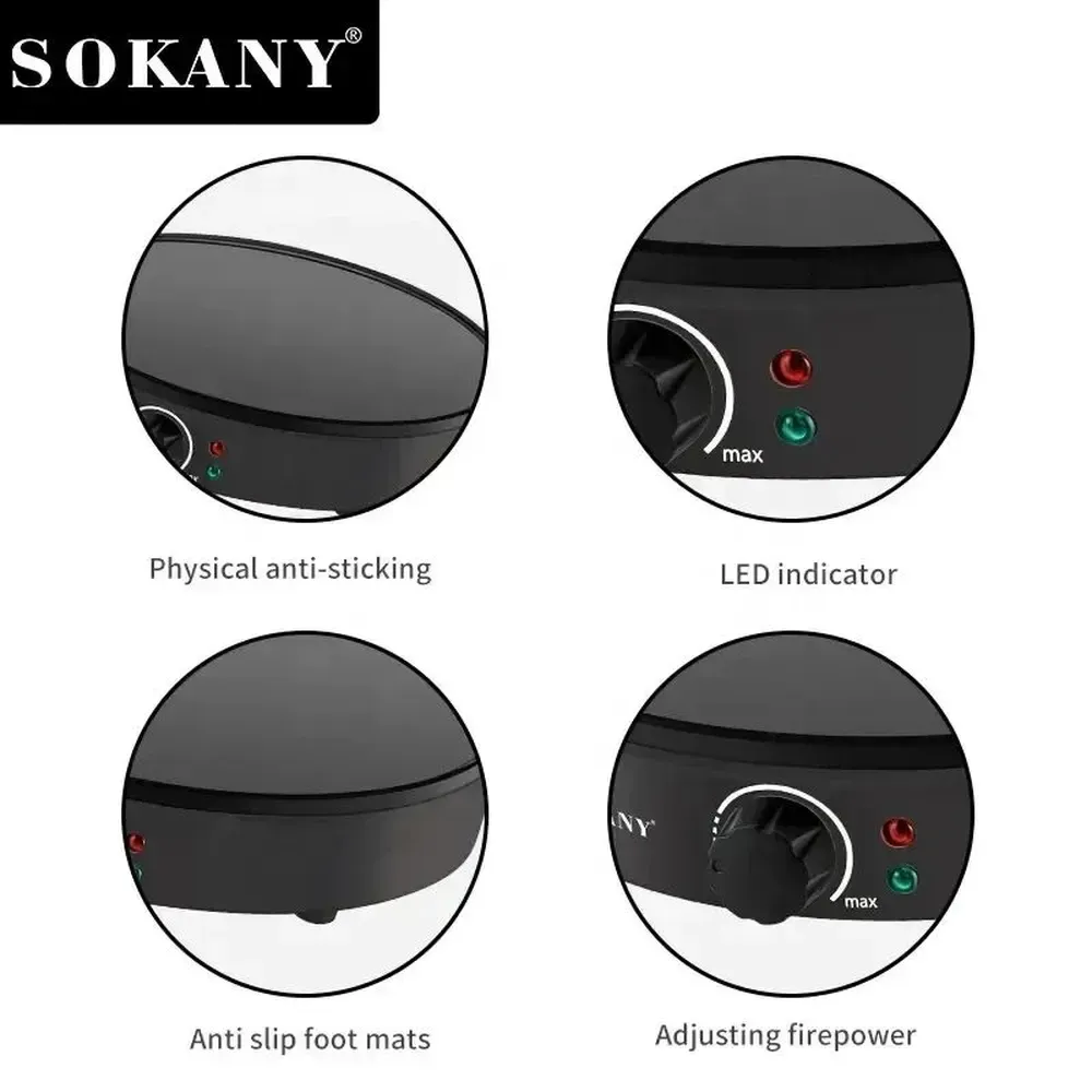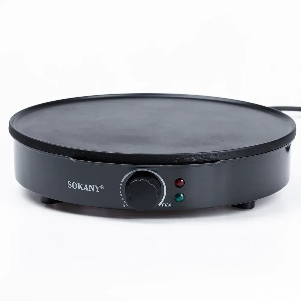 - Ефективне готування. З потужністю 1000 Вт і діаметром 30 см, млинниця Sokany забезпечує швидке і рівномірне приготування млинців.