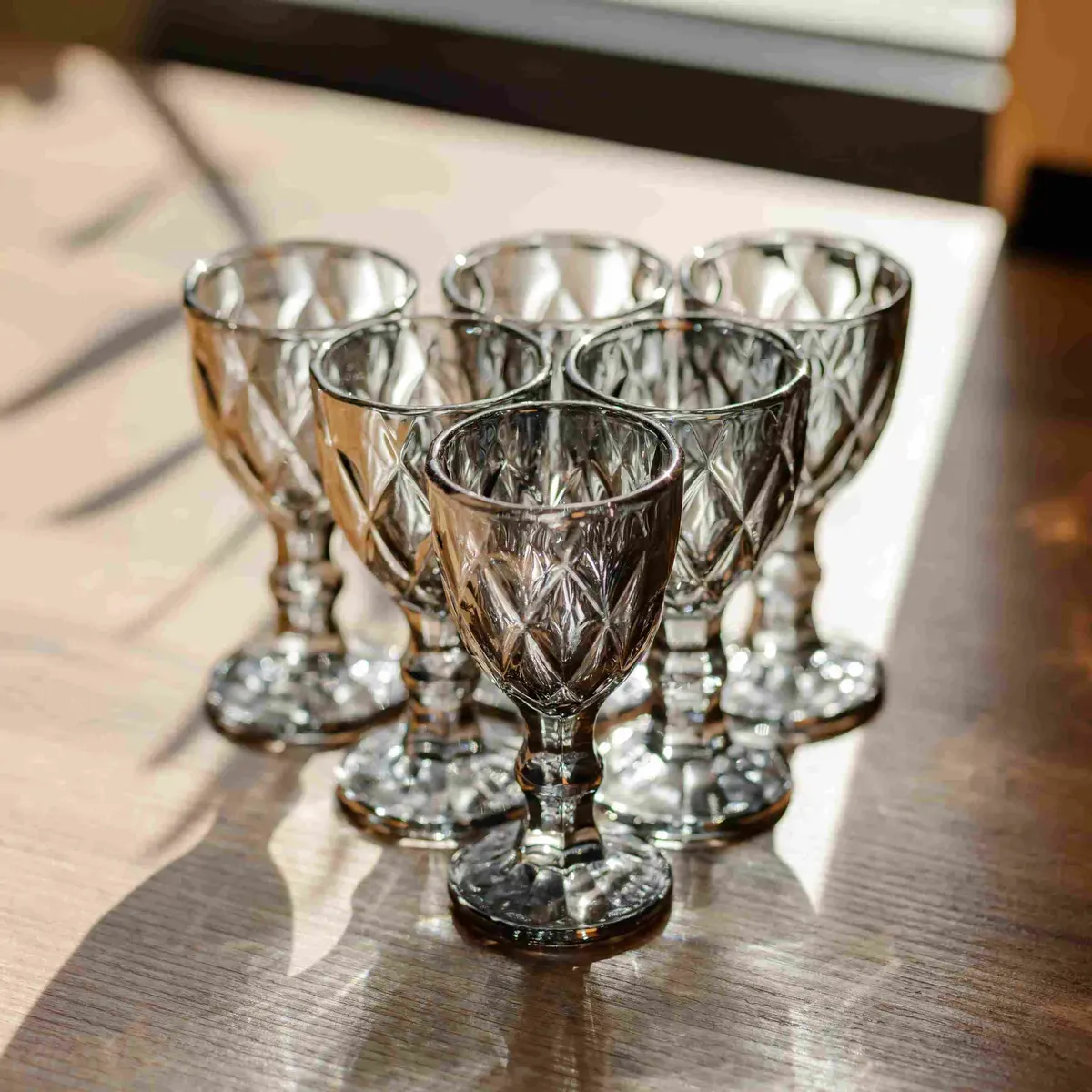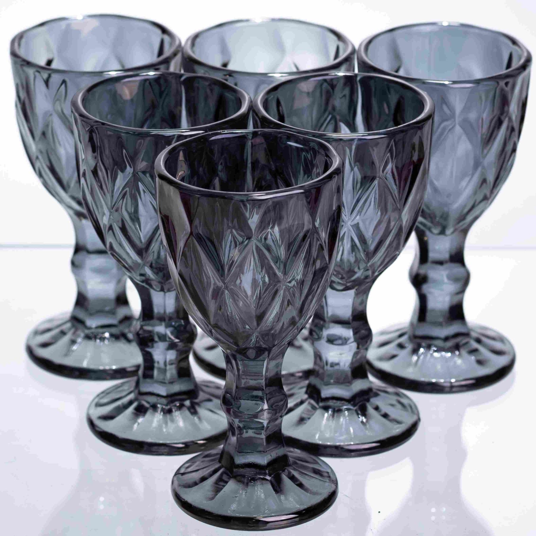 Комплект вишуканих чарок із тонованого скла глибокого графітового відтінку. Завдяки своїй компактній формі та виразному рельєфному візерунку, вони стануть стильним доповненням до сервірування столу. Особливості: Фактурний дизайн: Поверхня чаші прикрашена об'ємним алмазним огранюванням, яке красиво заломлює світло і робить чарки більш стійкими при захопленні рукою. Благородний колір: Темний графітовий відтінок скла надає посуду сучасного та статусного вигляду. Стійкість: Кожна чарка встановлена на фігурній ніжці з основою, що гарантує стабільність. Характеристики: Матеріал: скло Об'єм: 50 мл Висота: 10 см Діаметр: 4,5 см Вага: 800 г