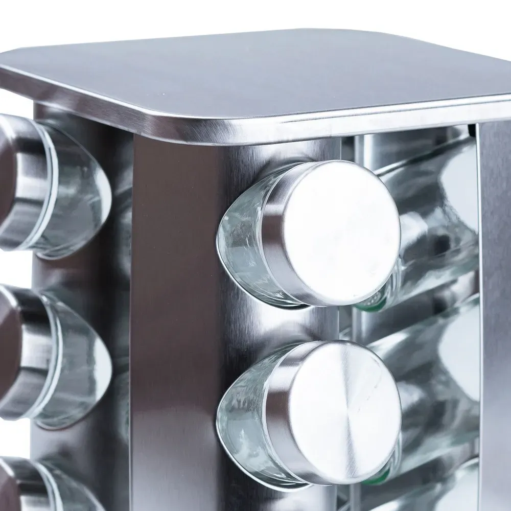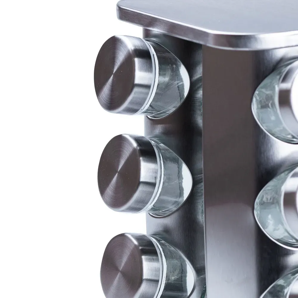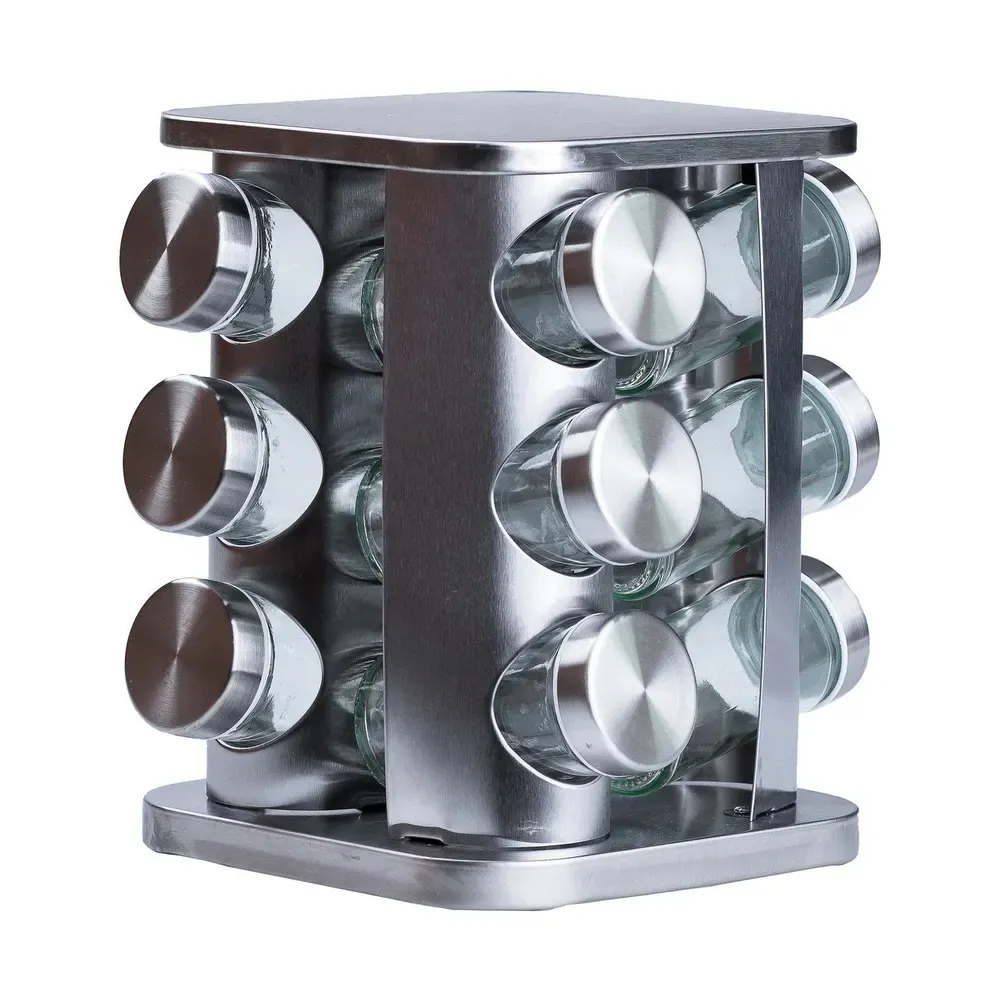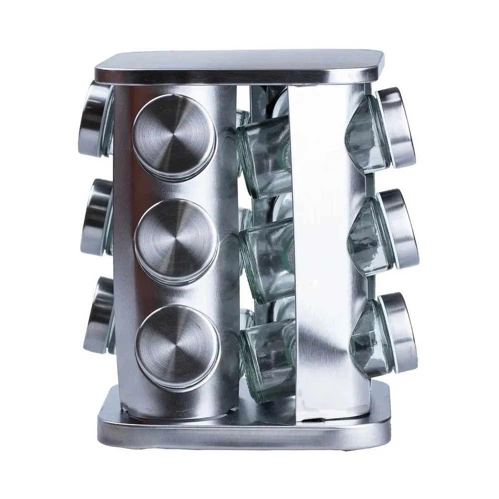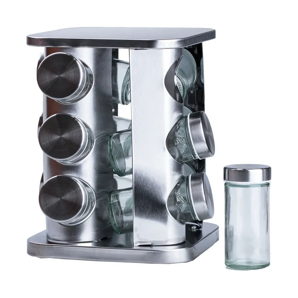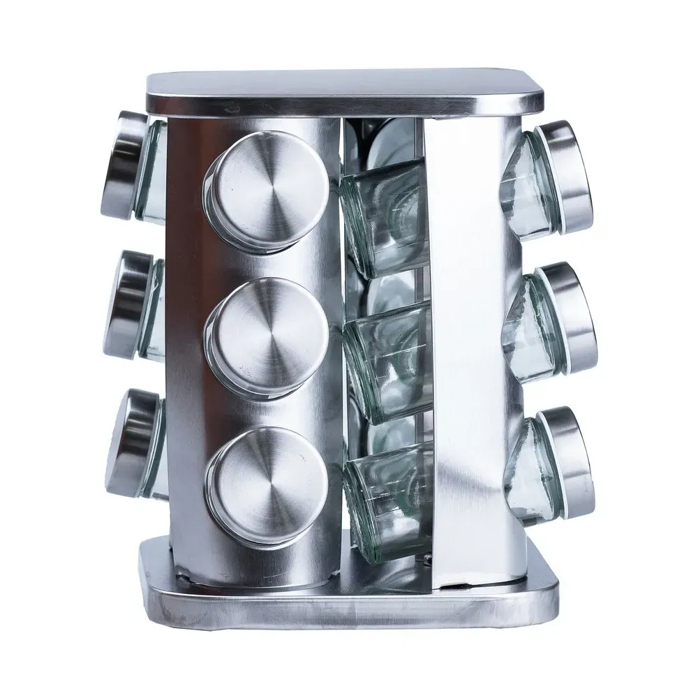 Набір для спецій на підставці включає 12 ємностей. Кожна ємність призначена для зручного зберігання та дозування різних спецій. Підставка не тільки забезпечує надійну підтримку для ємностей, але й надає набору стильного та органічного вигляду. Набір спецій на підставці є практичним та естетичним доповненням до вашої кухні, забезпечуючи зручність у використанні та порядок при зберіганні спецій.