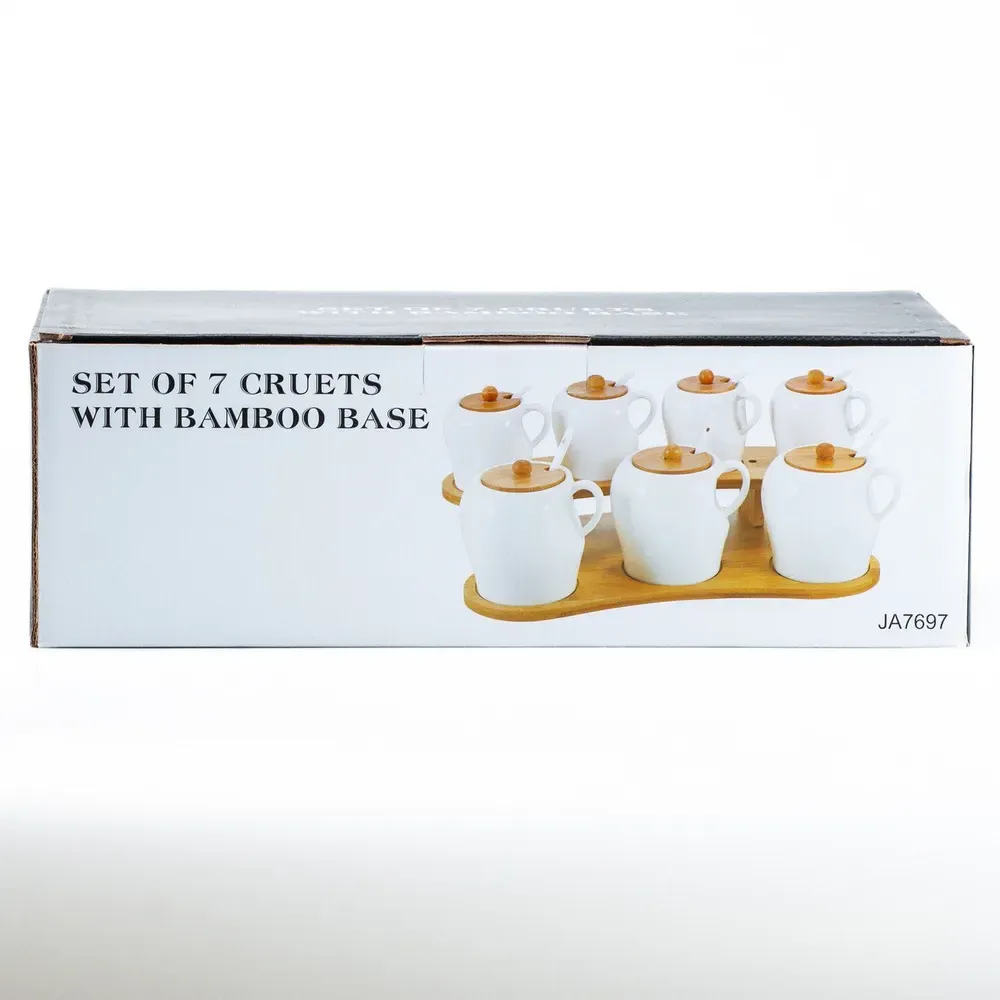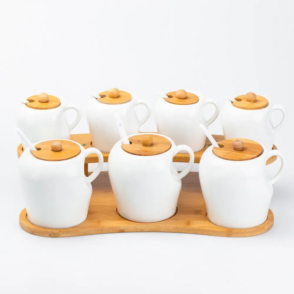 Набір ємностей для спецій із ложками на дерев'яній підставці 7 шт баночки 300 и 600 мл (HP248)