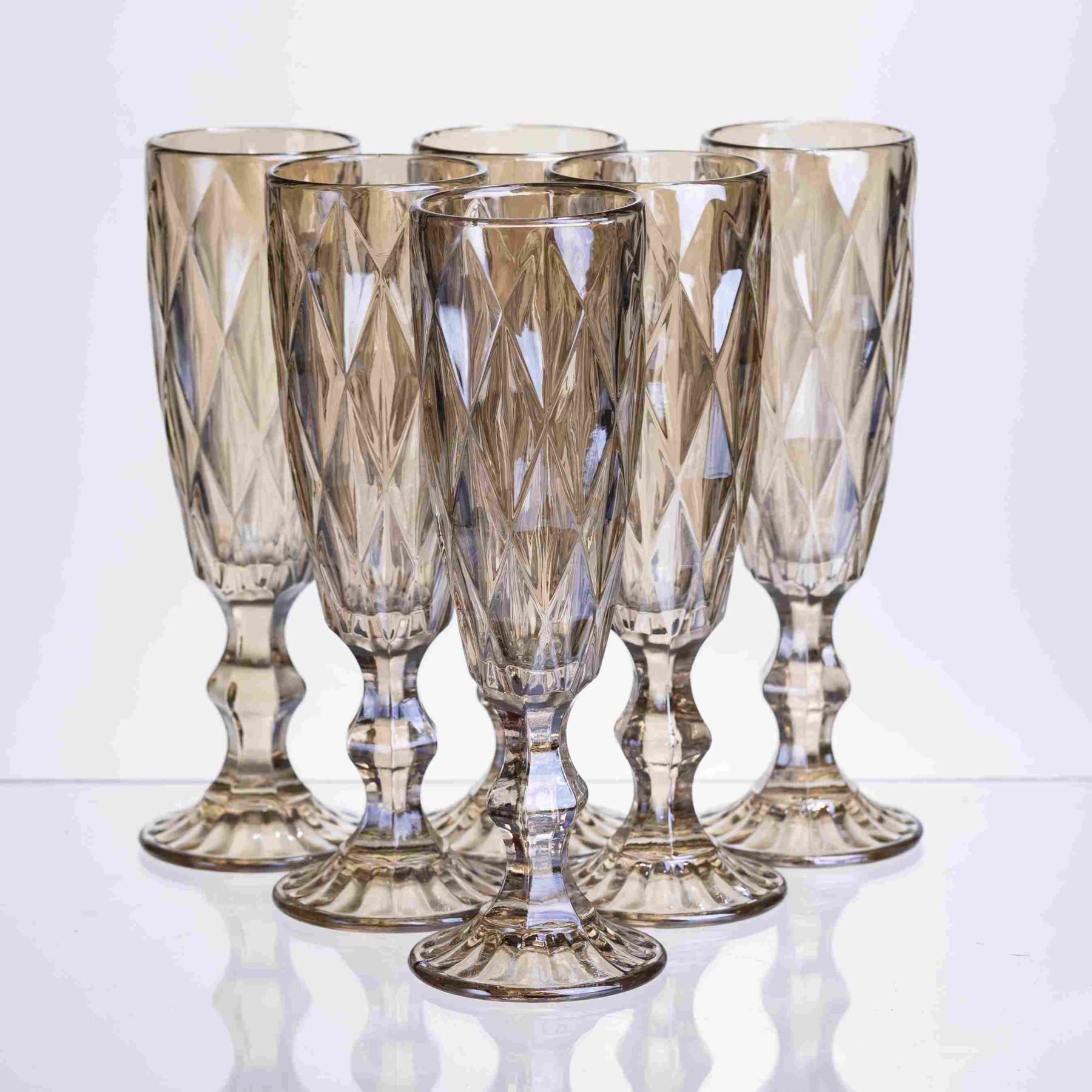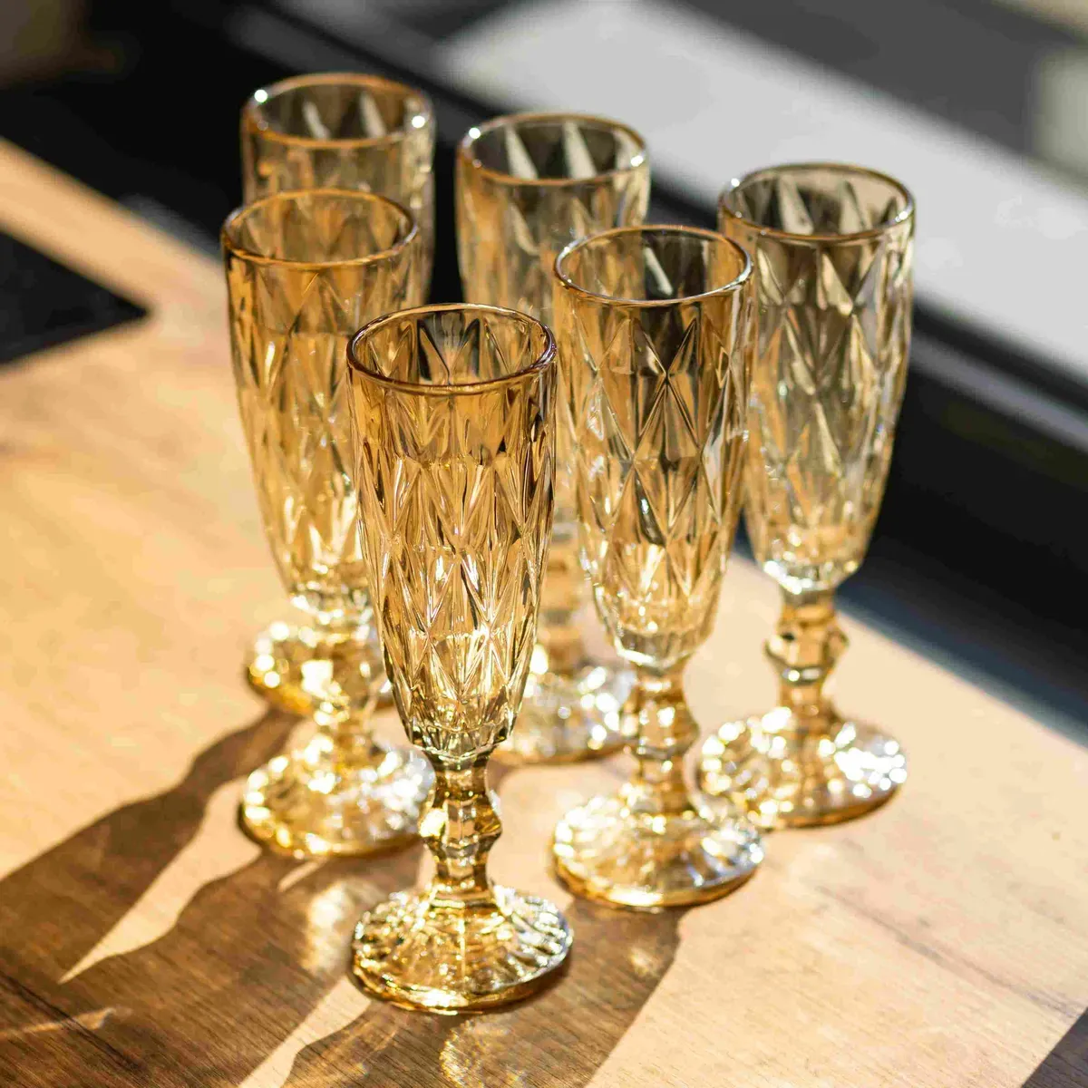 Елегантний комплект келихів із тонованого скла в теплому бурштиновому відтінку. Висока чаша типу «флюте» та класичне алмазне огранювання створюють розкішну гру світла, роблячи їх ідеальним вибором для святкового сервірування. Особливості: Бурштиновий відтінок: Теплий золотисто-медовий колір скла надає сервіруванню затишку та створює відчуття свята, особливо при природному освітленні. Алмазна грань: Рельєфний геометричний візерунок не тільки естетичний, а й практичний - келих надійно лежить у руці і не вислизає. Витончена форма: Висока струнка чаша на тонкій фігурній ніжці ідеально підходить для подачі шампанського, ігристих вин та легких коктейлів. Характеристики Матеріал: скло Об'єм: 180 мл Висота: 19,3 см Вага: 2 кг