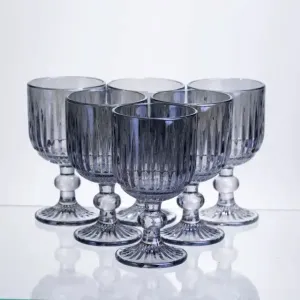 Набір келихів для вина об’ємом 220 мл призначений для подачі червоних і білих вин у повсякденному та святковому форматі. Виготовлені з товстого скла, келихи мають збалансовані пропорції та стійку конструкцію, що робить їх практичними у використанні. Поверхня келихів рифлена, з чіткими вертикальними лініями по всій чаші, що створює гру світла та додає виробу візуальної глибини. Чаша має форму широкого, відкритого кубка, злегка розширеного догори, що забезпечує зручну подачу вина. Келихи оснащені короткою фігурною ніжкою та широкою круглою основою, що гарантує стійкість і комфортний захват. Висота 14 см і діаметр 7.5 см роблять келихи зручними у користуванні, а набір із 6 штук стане практичним доповненням до домашнього посуду або сервірування столу. Характеристики: Тип: келихи для вина Кількість: 6 штук Об’єм: 220 мл Матеріал: товсте скло Висота: 14 см Діаметр: 7.5 см Дизайн: ребристий Форма чаші: широкий, відкритий кубок