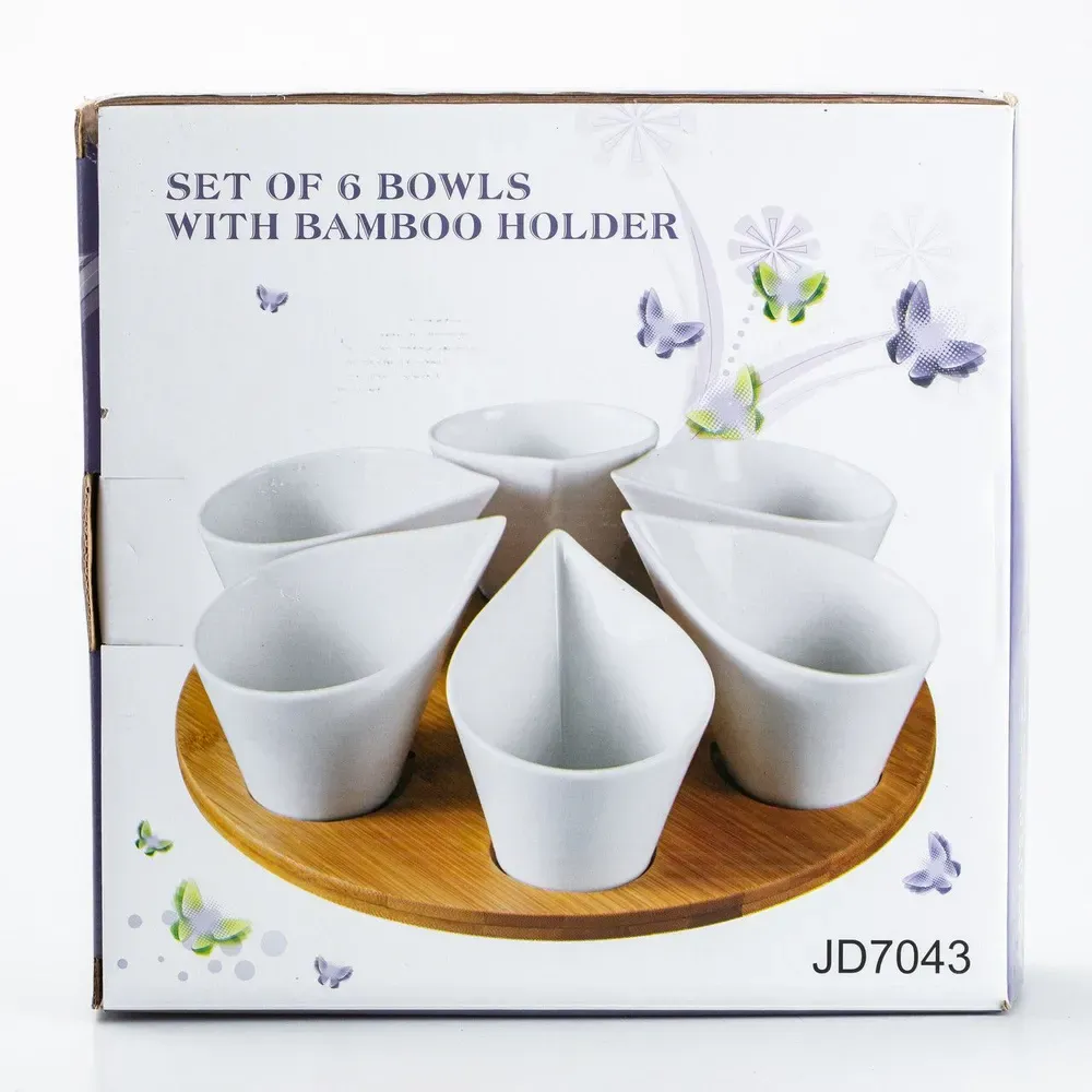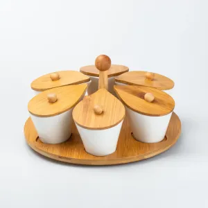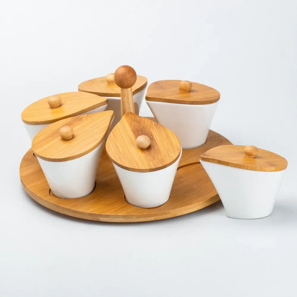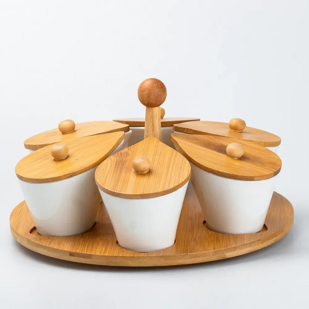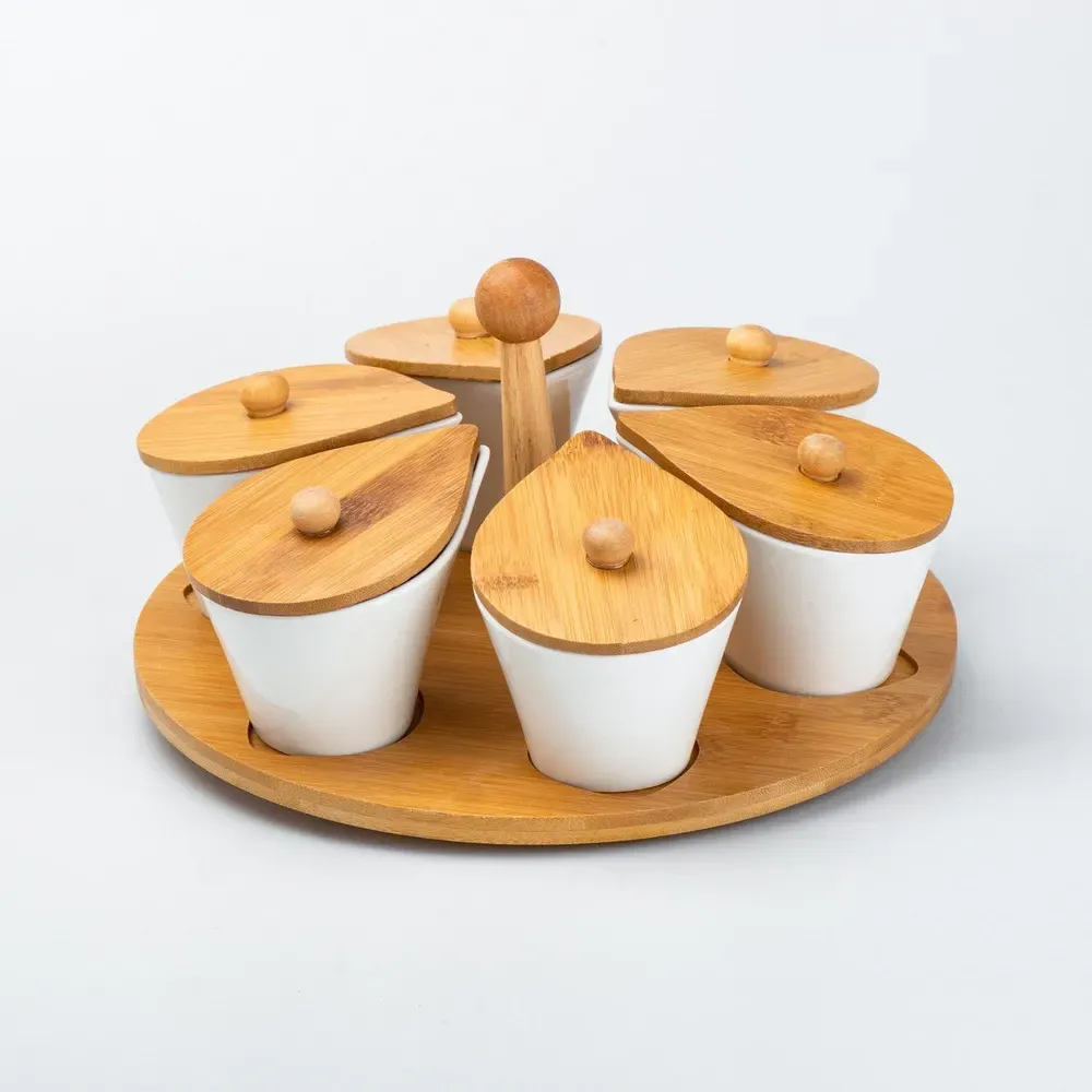 Набір керамічних баночок для приправ з ложкою та бамбуковою кришкою. Набір складається із шести банок для спецій. Висота банки 9.5 см, діаметр 28 см.
